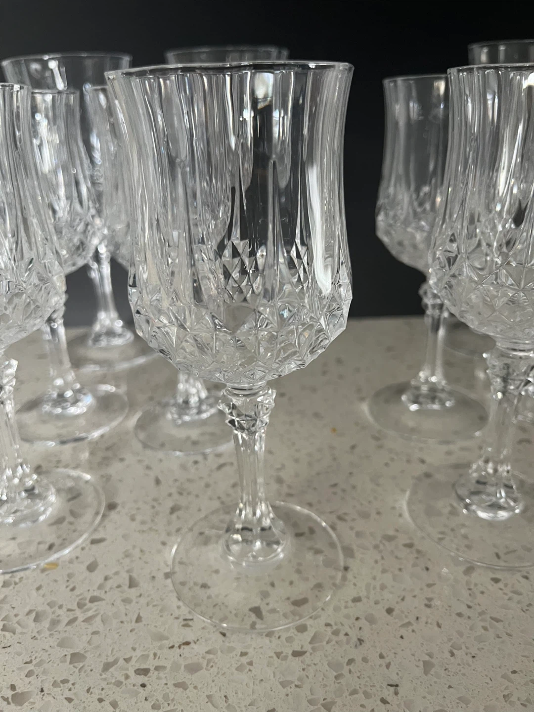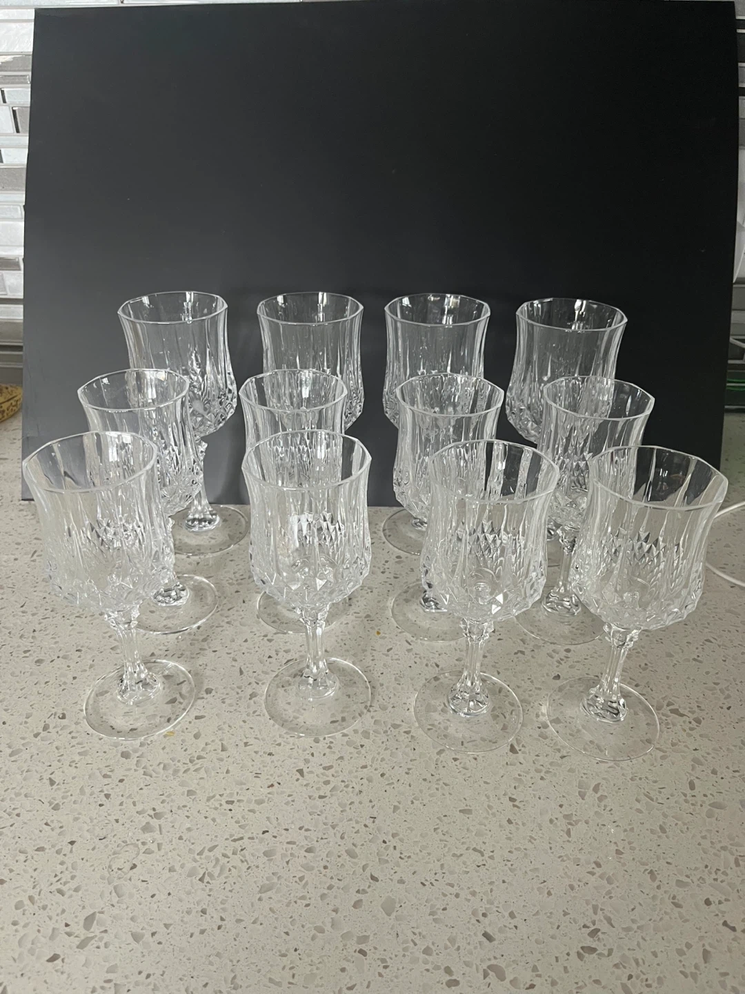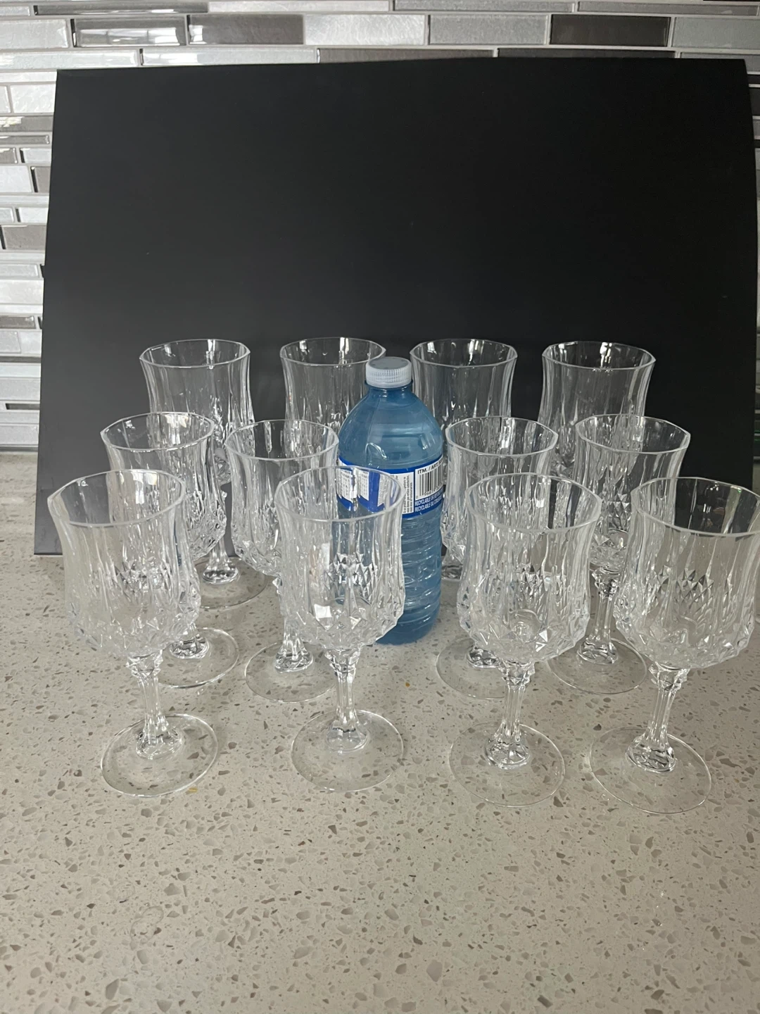 Beautiful set of 12 , 4 tall ones and 8 short ones crystal cut wine glasses. These glasses feature an elegant diamond pattern. Perfect for hosting or special occasions!