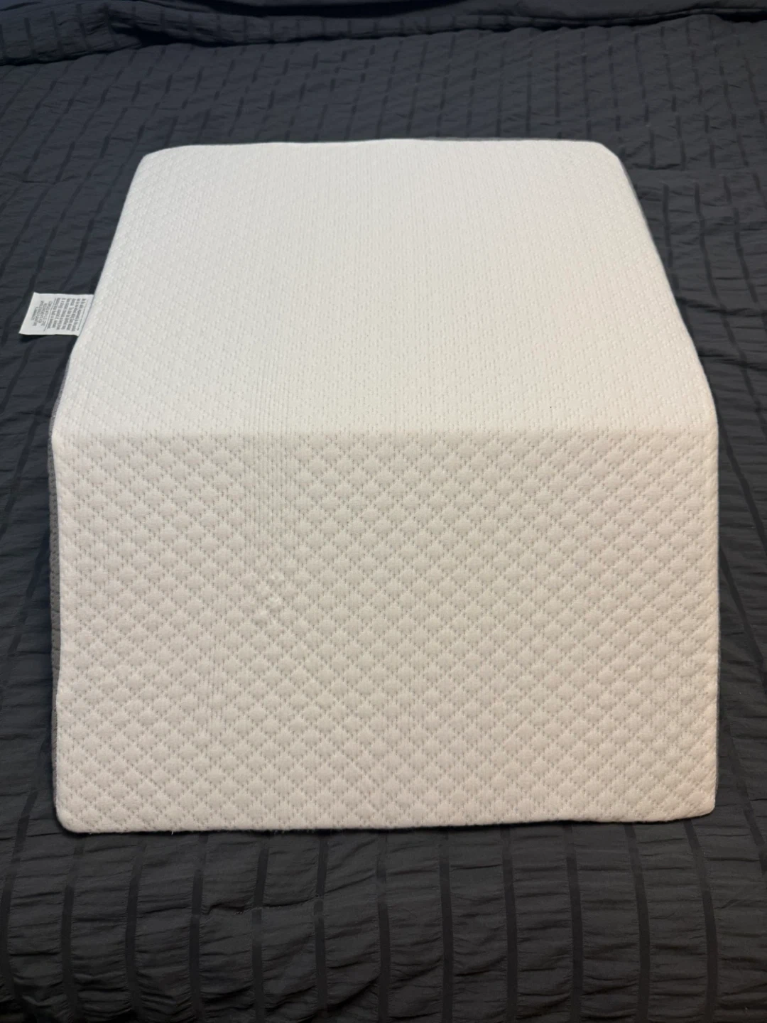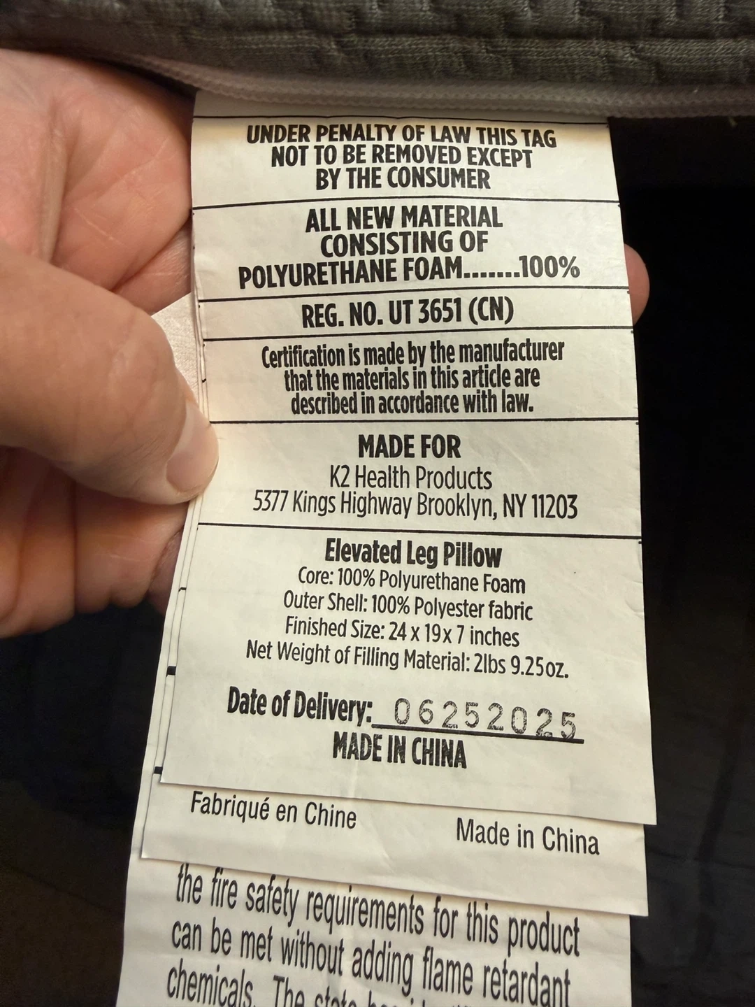 This is an elevated leg pillow. Core is 100% Polyurethane Foam. Outer shell is 100% Polyester fabric. Finished size is 24 x 19 x 7 inches. Useful for elevating legs after surgery or for comfort. Smoke free home. Brand new item. Pick up in Welland.