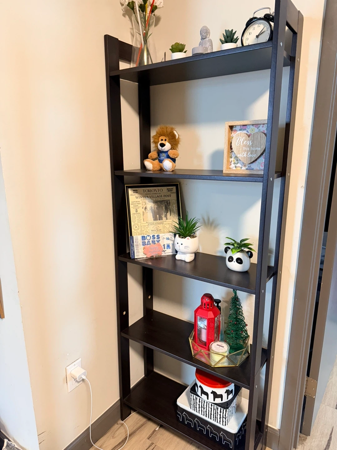 This dark brown leaning bookshelf has five shelves. It's a great way to display books and decor. Made of wood, it measures approximately 60 inches tall.