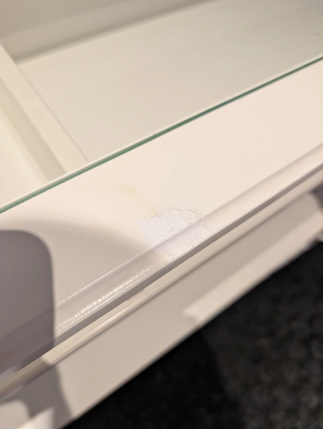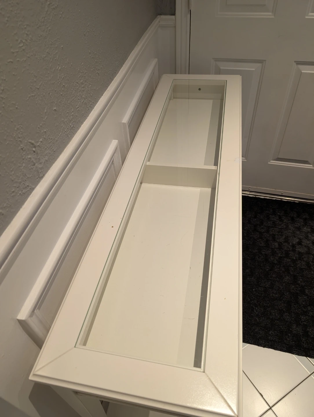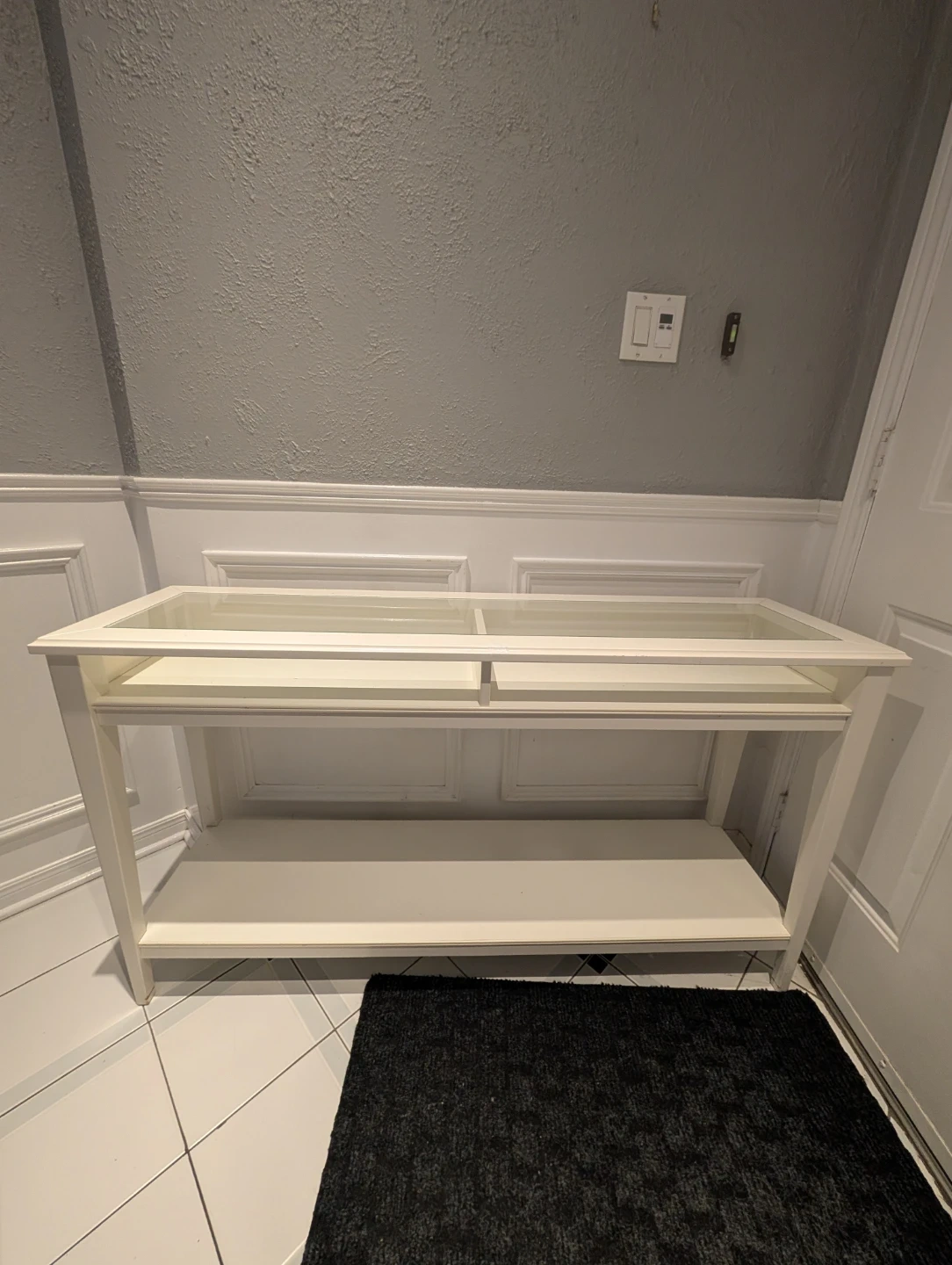 White console table with a glass display top. It has two storage compartments and a lower shelf. Some minor marks on the frame.