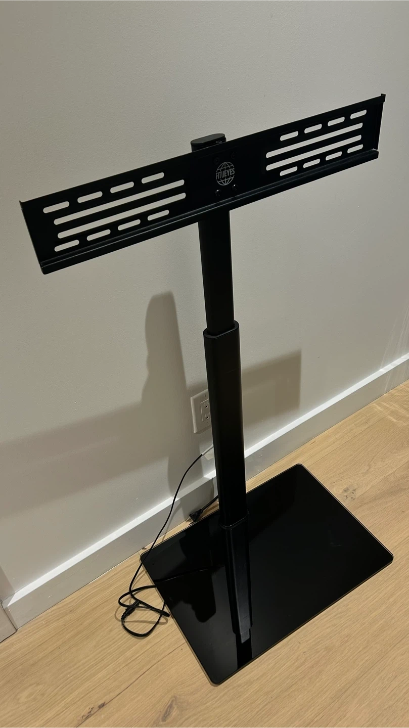 This black, metal TV stand from FITUEYES can hold TVs up to 66 lbs. Suitable for 32”-60” TV’s. It features a height-adjustable mount and a tempered glass base for stability. The shelf is not included. The Brackets and Hardware are inculded!! (Not pictured)