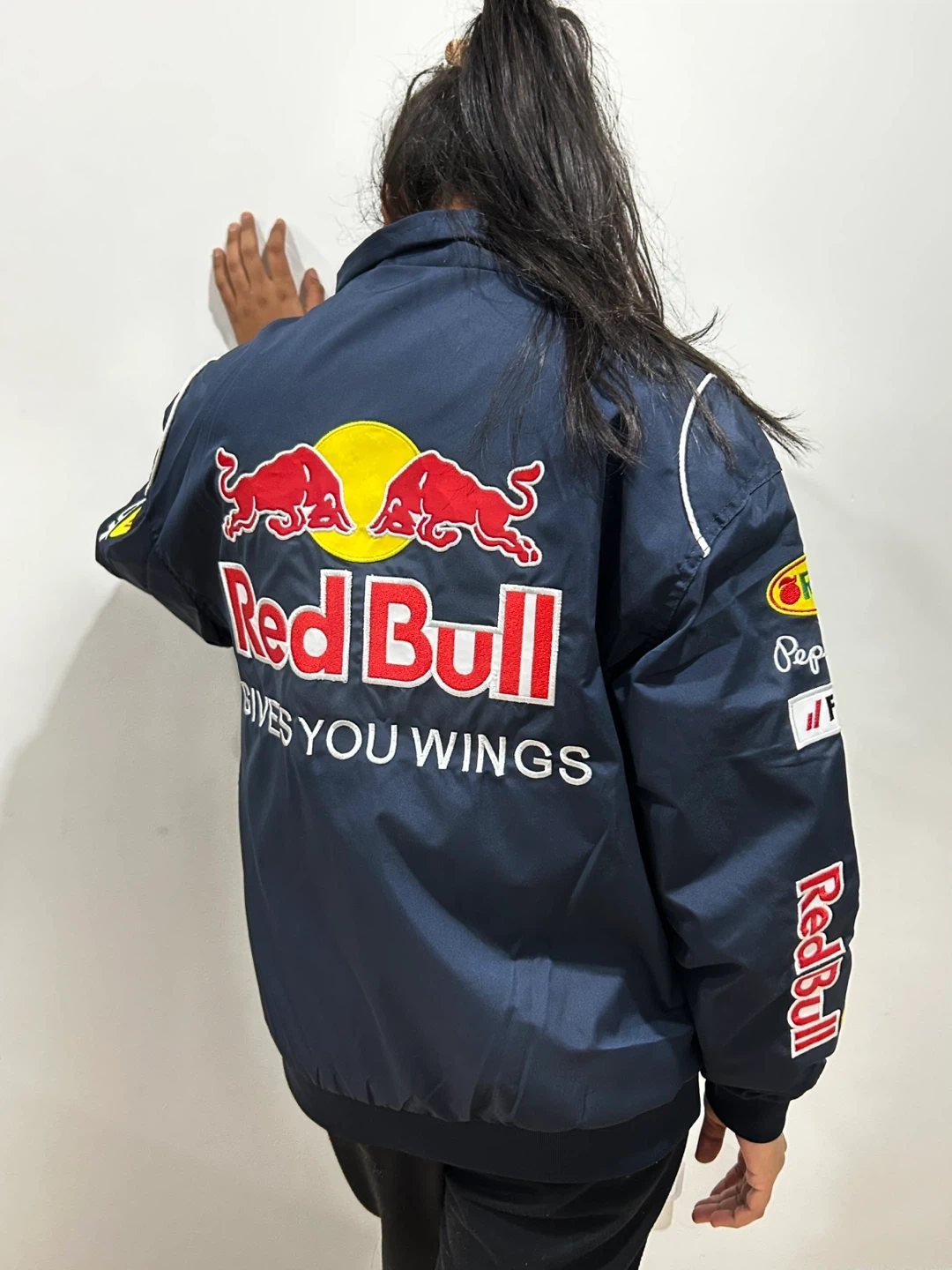 This Red Bull Infiniti racing jacket features multiple sponsor logos. It's made from a durable material. This jacket is perfect for any motorsports fan!