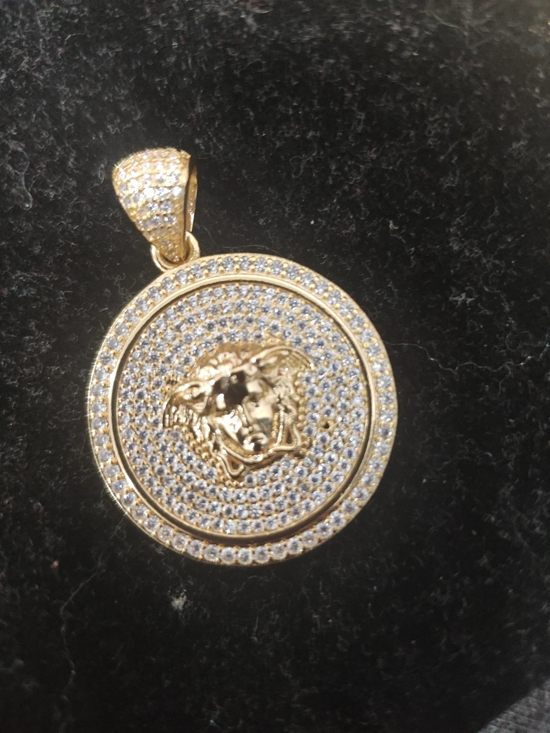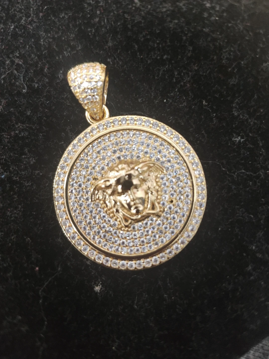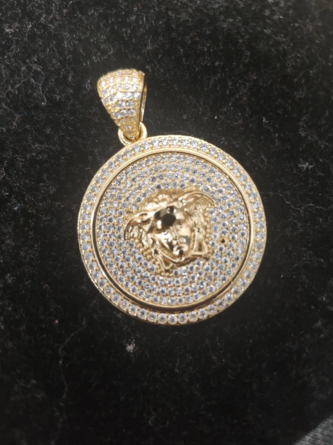 This pendant features a gold-toned medallion with a detailed Medusa head at its centre. It's encrusted with small, clear cubic zirconia stones around the border and on the bail. This piece offers a bold statement for any jewellery collection.