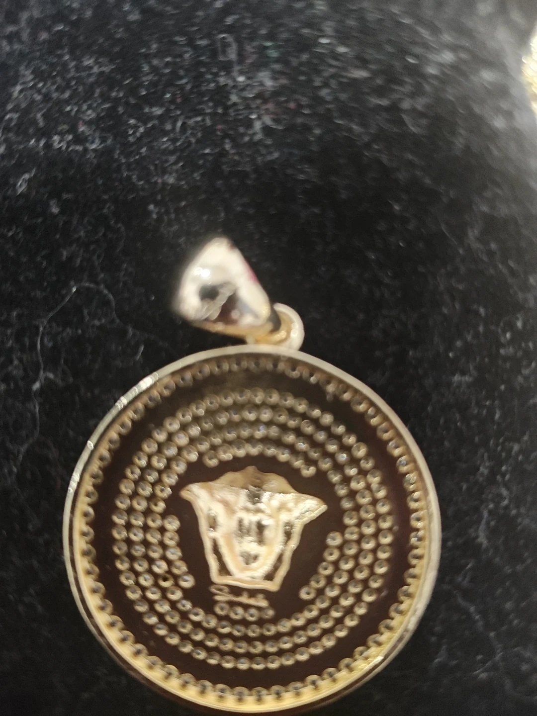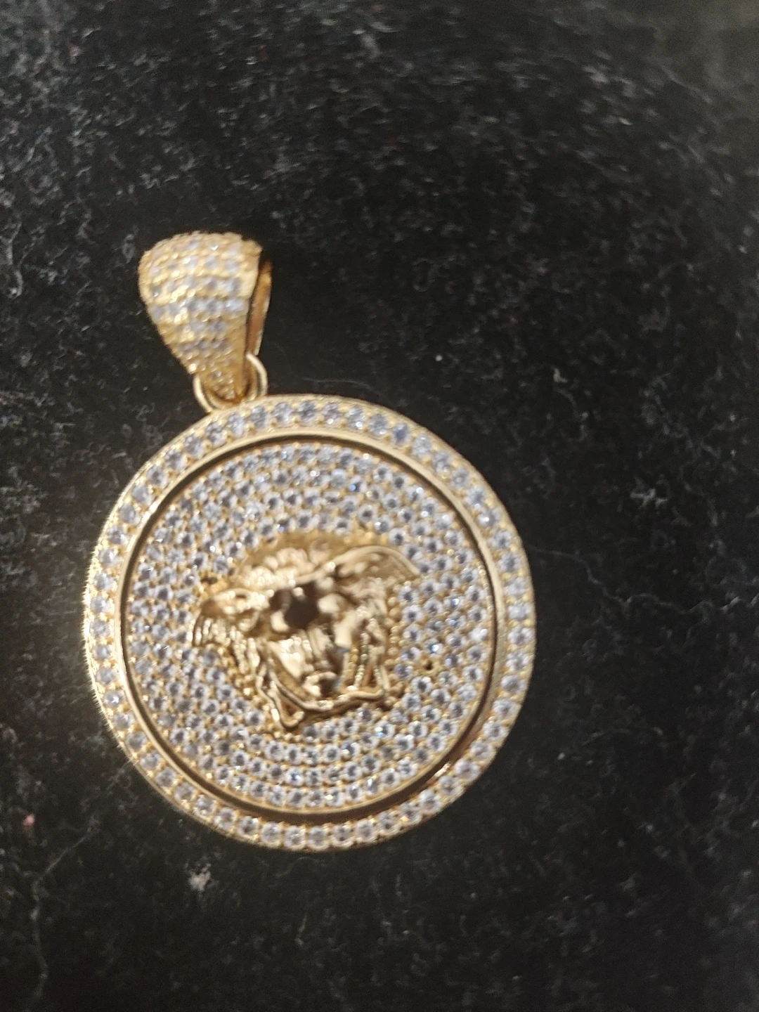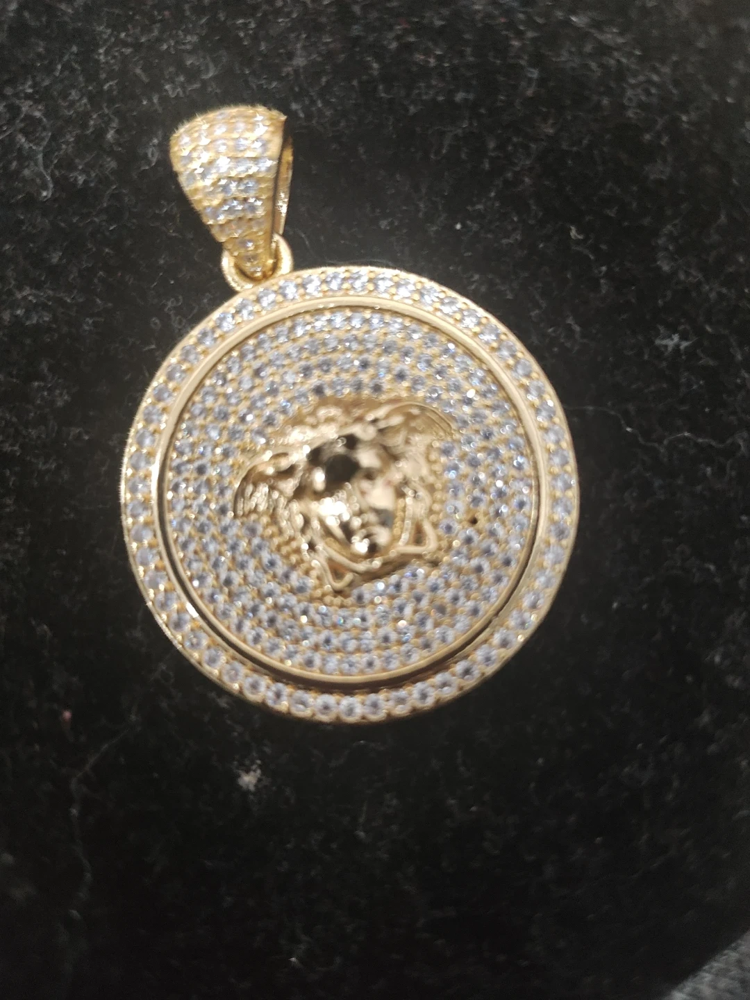 This pendant features a gold-toned medallion with a detailed Medusa head at its centre. It's encrusted with small, clear cubic zirconia stones around the border and on the bail. This piece offers a bold statement for any jewellery collection.