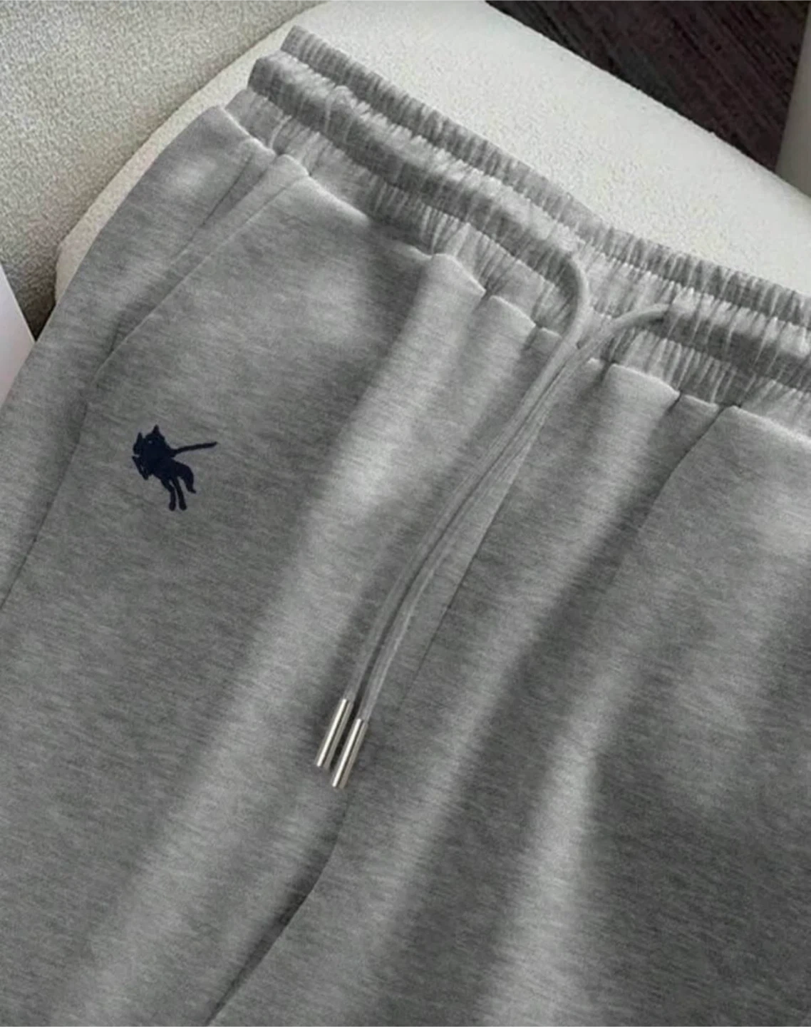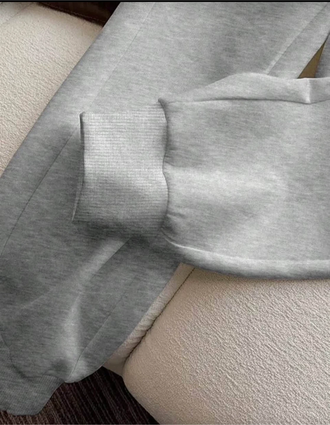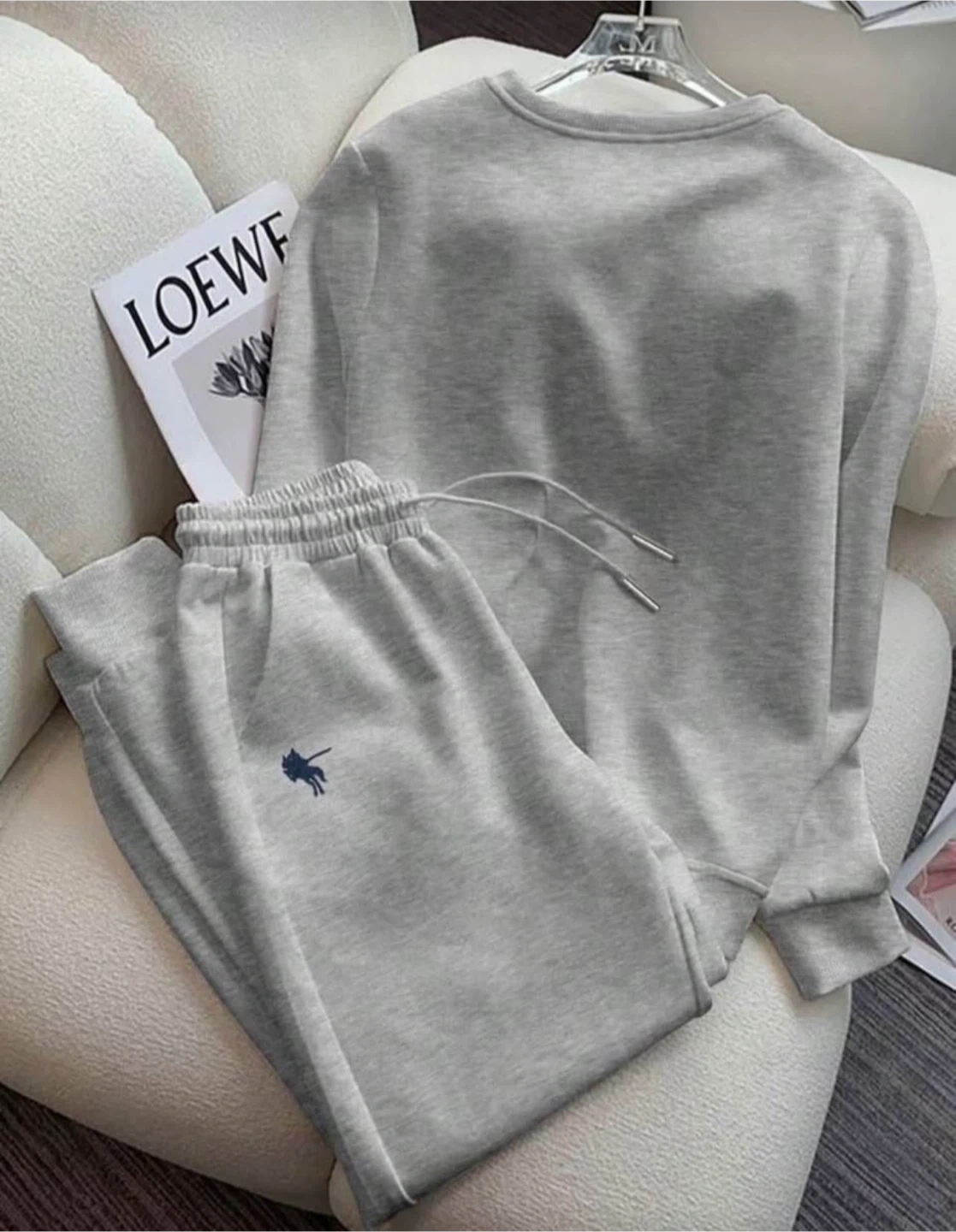 This is a grey fleece sweatshirt and matching joggers set. It features an embroidered horse logo on the left chest of the sweatshirt and left thigh of the joggers. The joggers have a drawstring waist and cuffed ankles. A comfy set for casual wear!