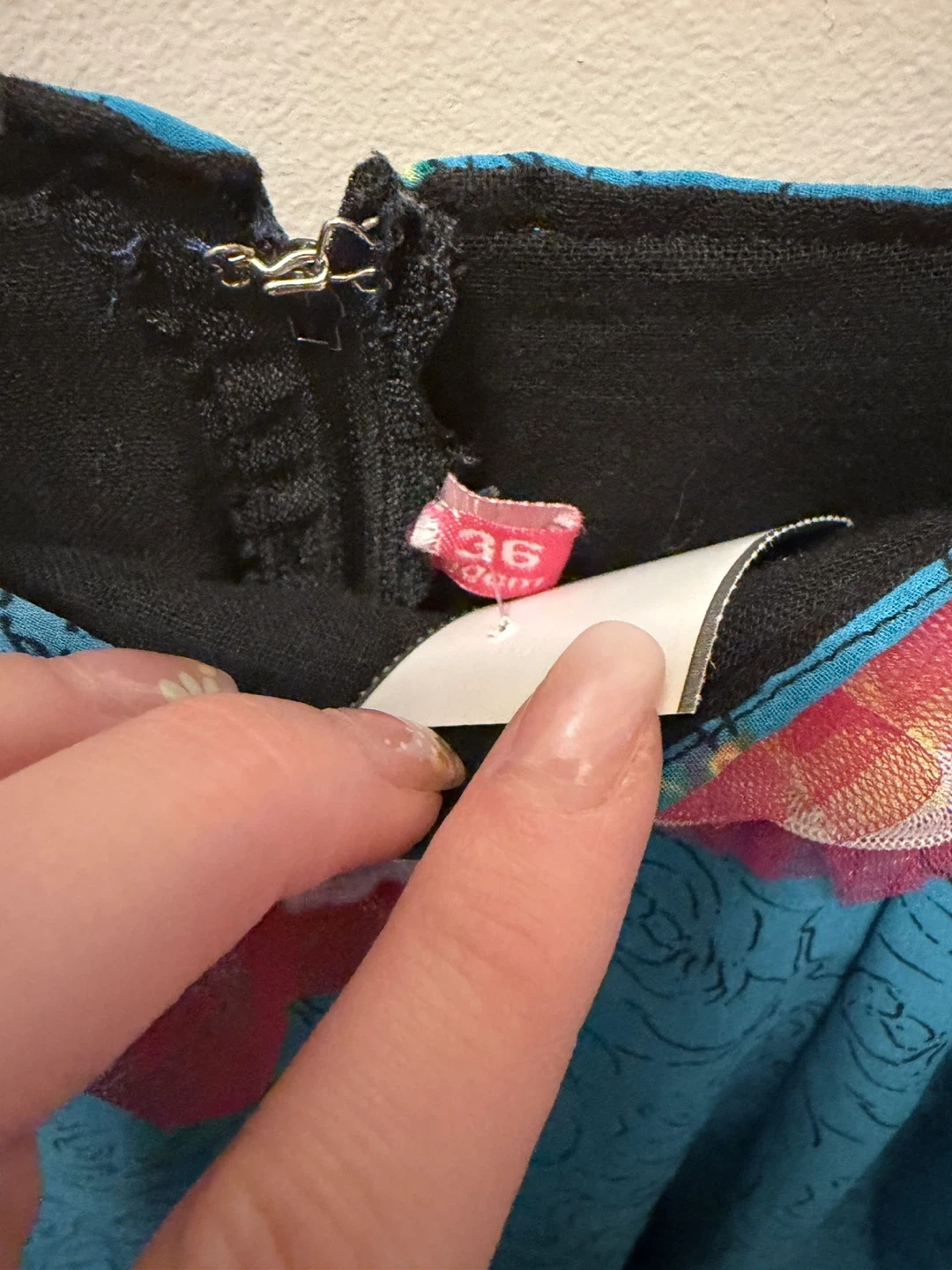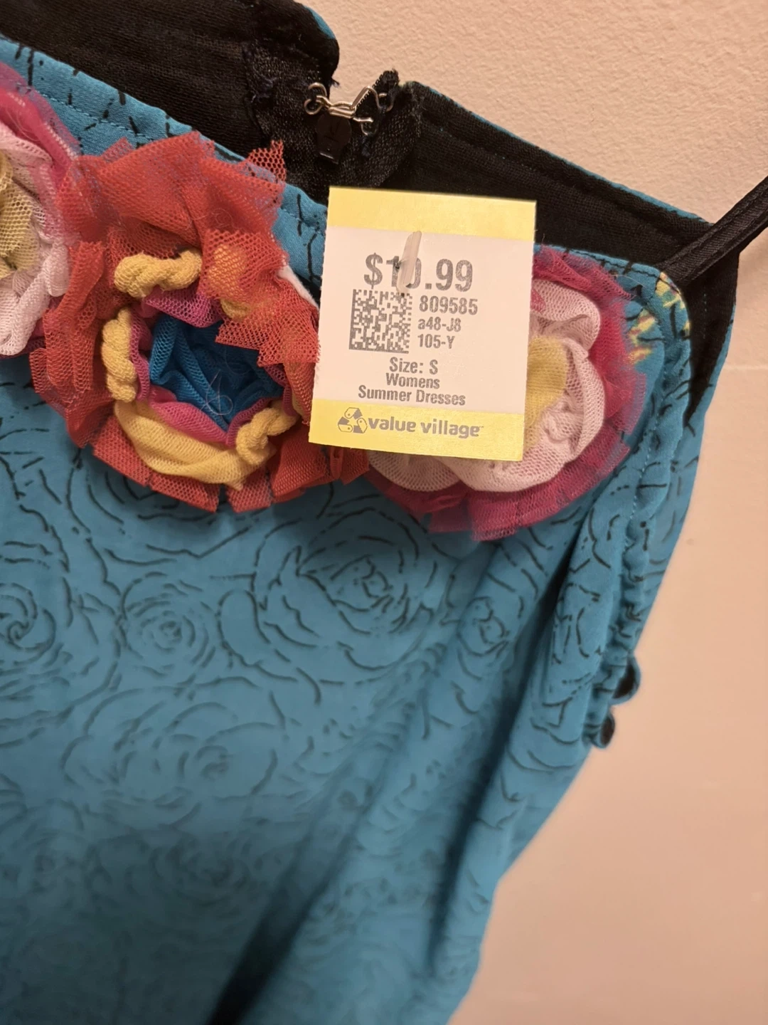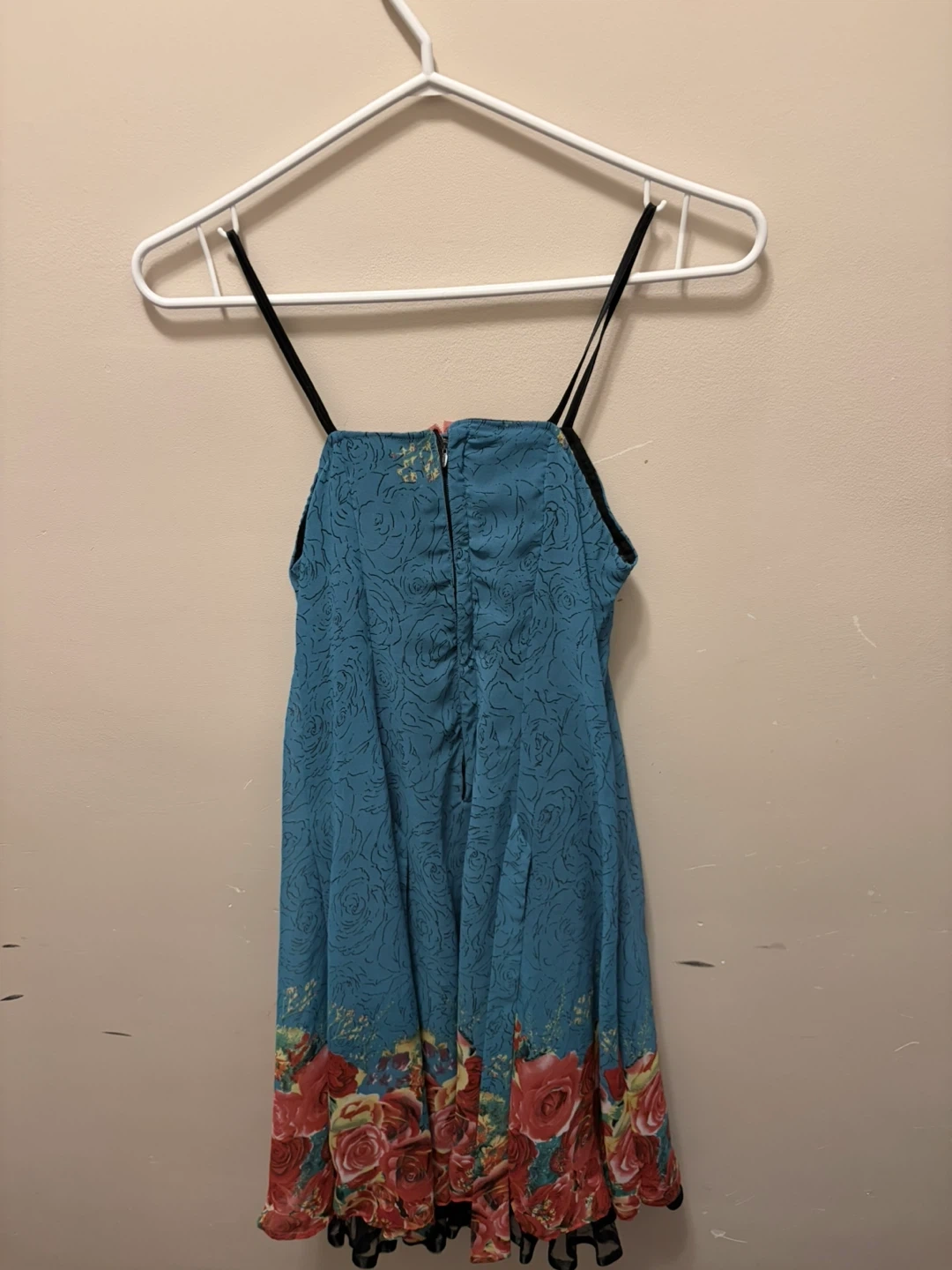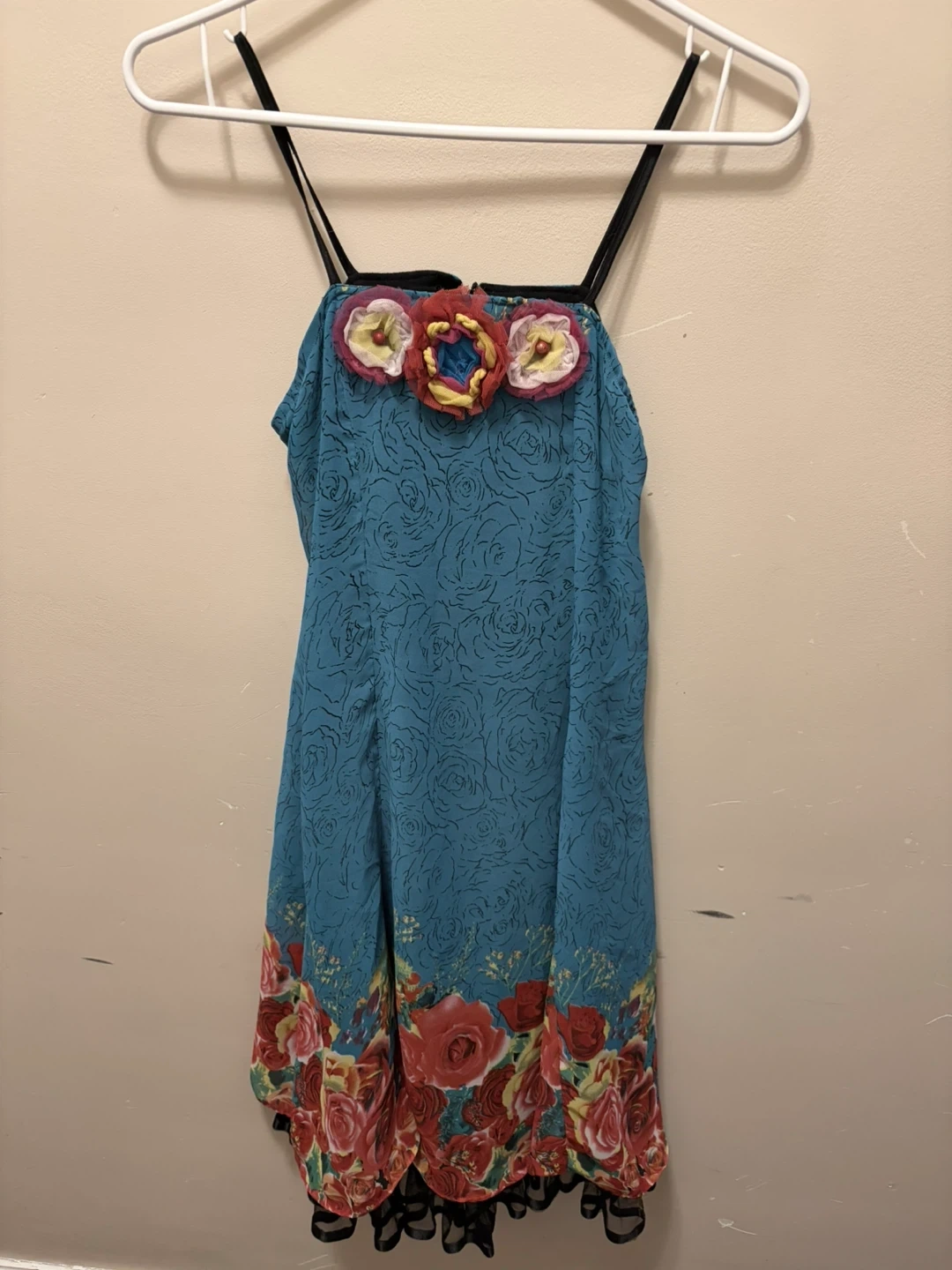 This blue sleeveless dress has a rose pattern all over. It's adorned with colourful applique flowers on the bust and a floral print hem with black lace trim. Size is small.
