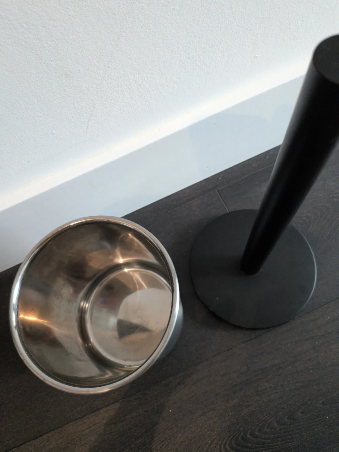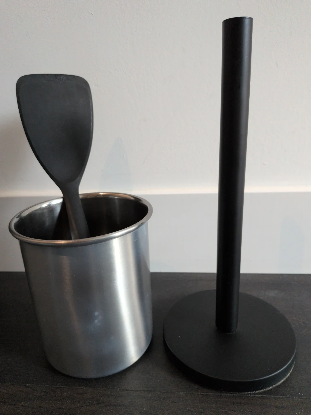 Stainless steel kitchen utensil holder with a black paper towel holder. This set includes one metal bin and one stand.