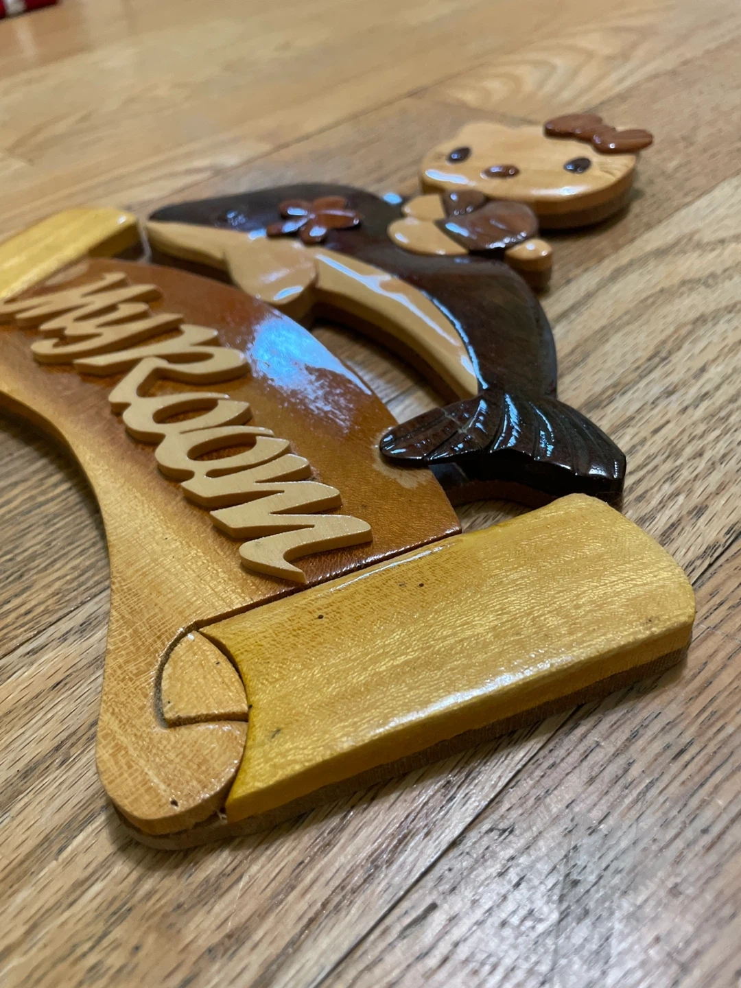 A cute wooden sign that says "My Room" with Hello Kitty riding a dolphin design. Can be hung.