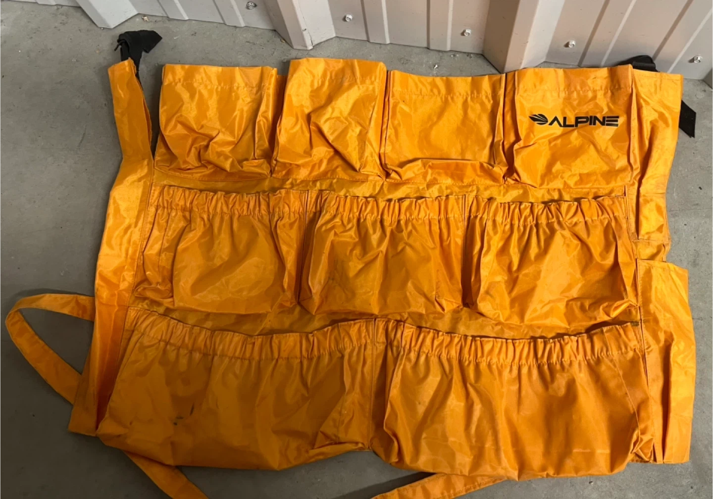 This is an Alpine tool roll organizer. It's bright orange and features multiple pockets for tools or supplies. Made of durable nylon material. Great for mechanics or DIYers!