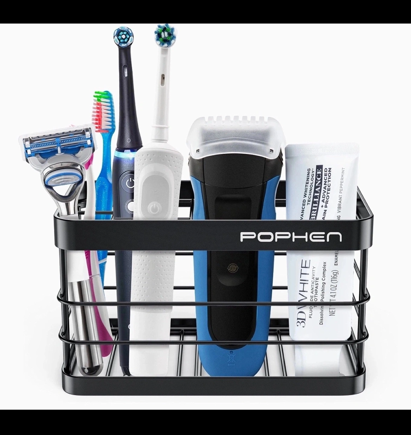 Bathroom caddy, black metal wire construction. Great for organizing toiletries. Compact size, perfect for smaller spaces. Durable and easy to clean.