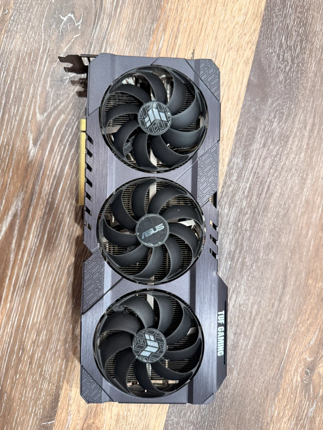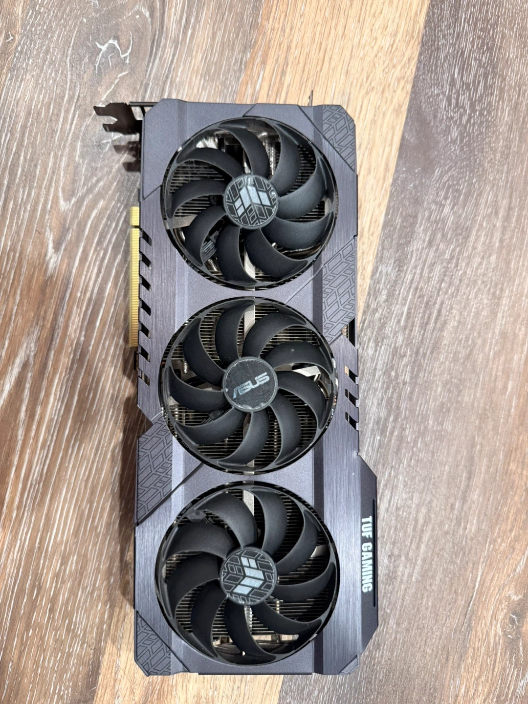 This is an ASUS TUF Gaming GeForce RTX 3080Ti graphics card. It features three cooling fans and a metal backplate. The card is designed for high-performance gaming and demanding applications.