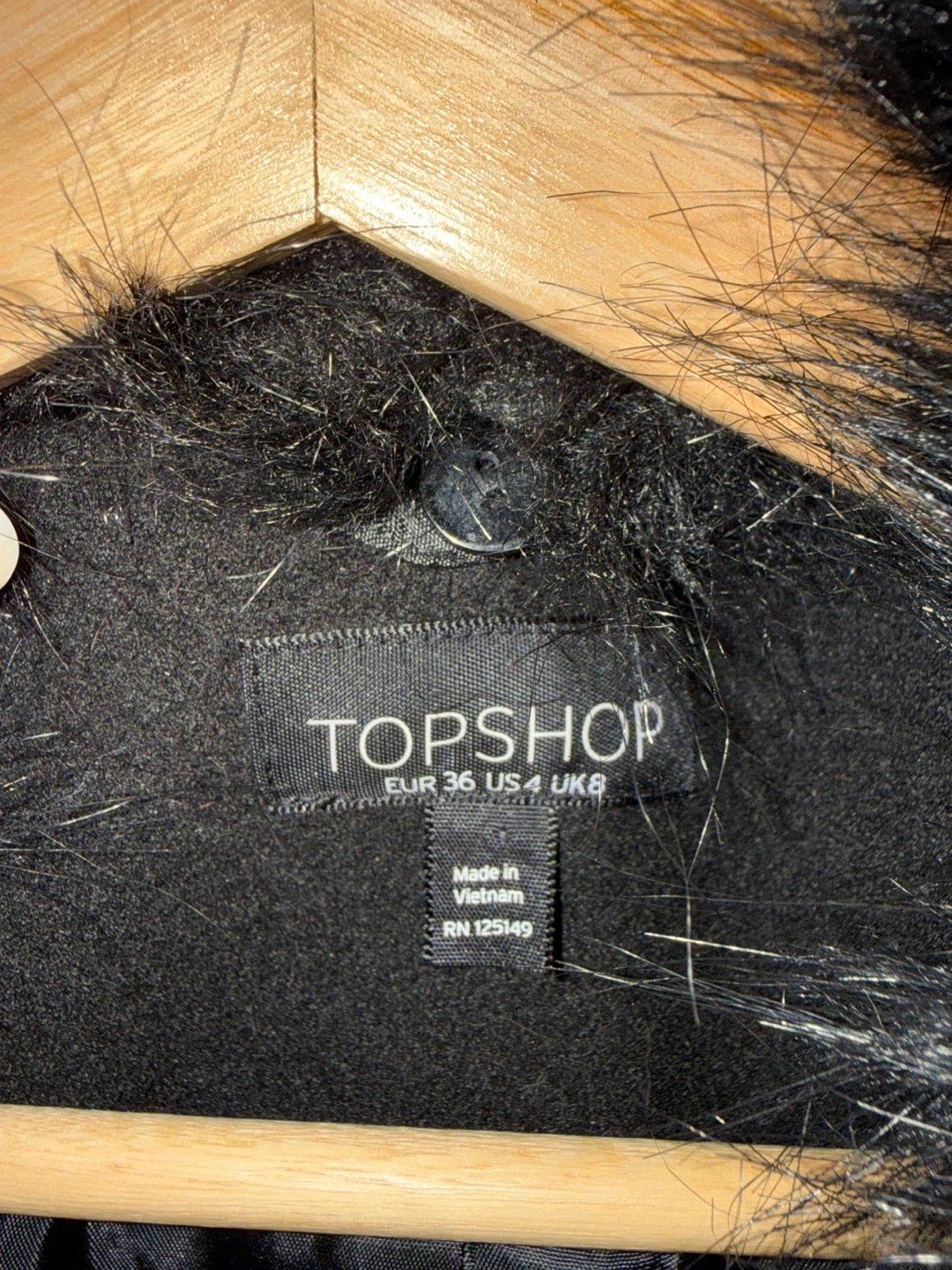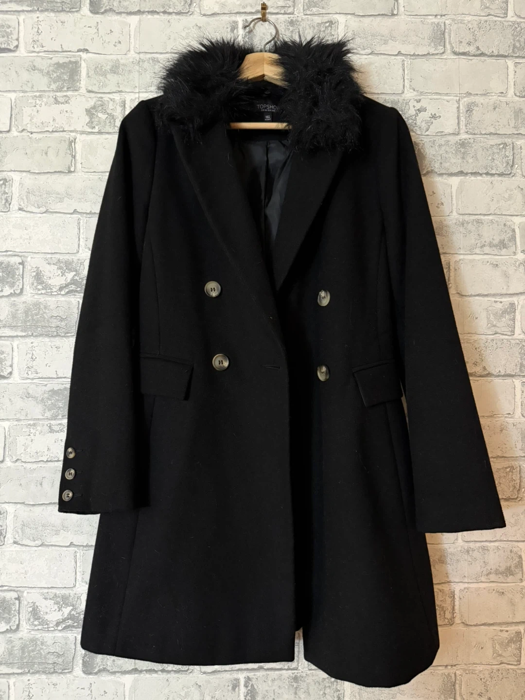 This is a TOPSHOP black double-breasted coat. It features a faux fur collar and button details. The coat is size UK 8.