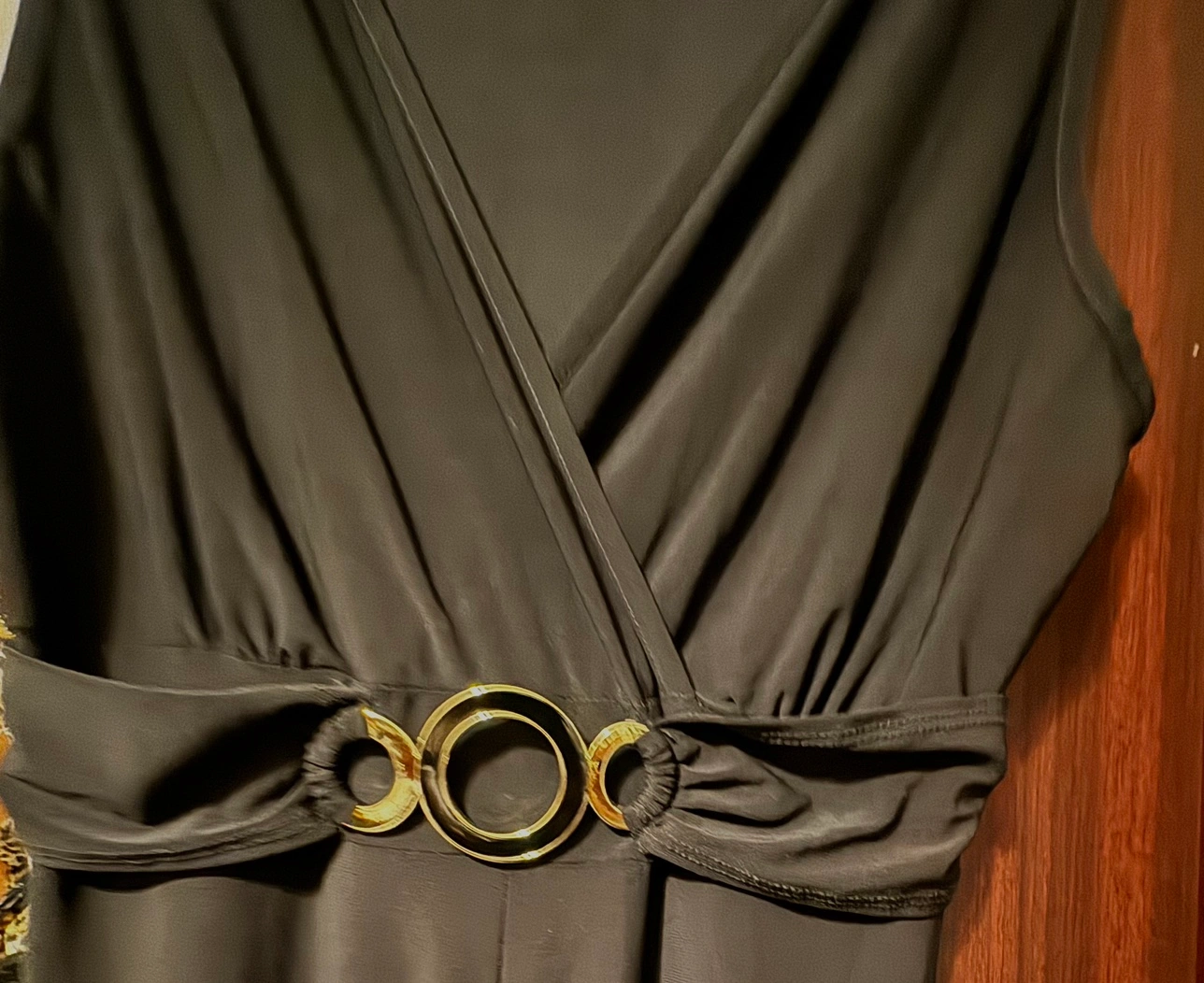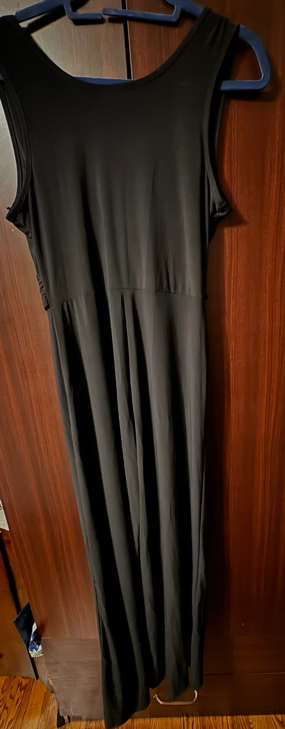 Size Medium, black, sleeveless, V-neck jumpsuit with gold belt and buckle. The fabric is a smooth, silky material.