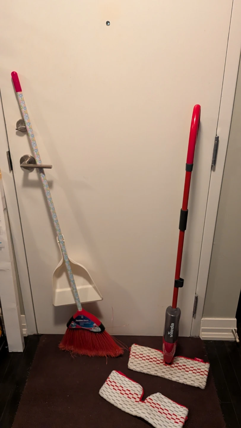 Red broom with a matching dustpan. Great for keeping your floors clean!