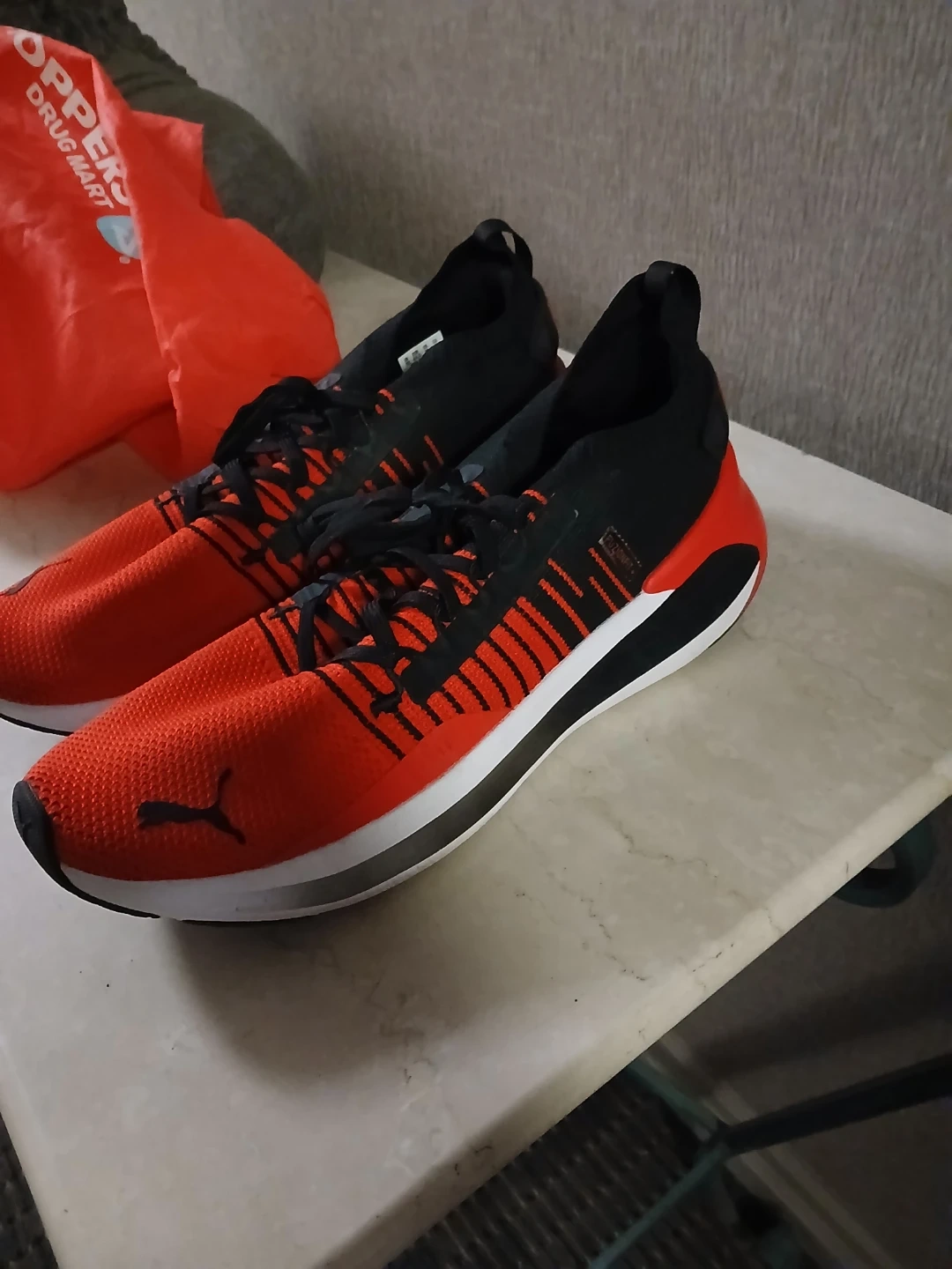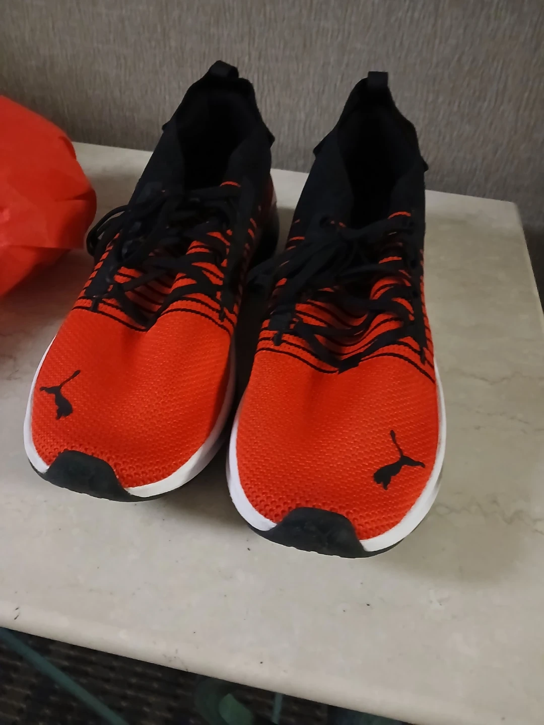 Puma athletic shoes in a bright orange and black knit design. Lace-up closure with a cushioned sole. Suitable for running or casual wear. Brand new never used from marks work warehouse