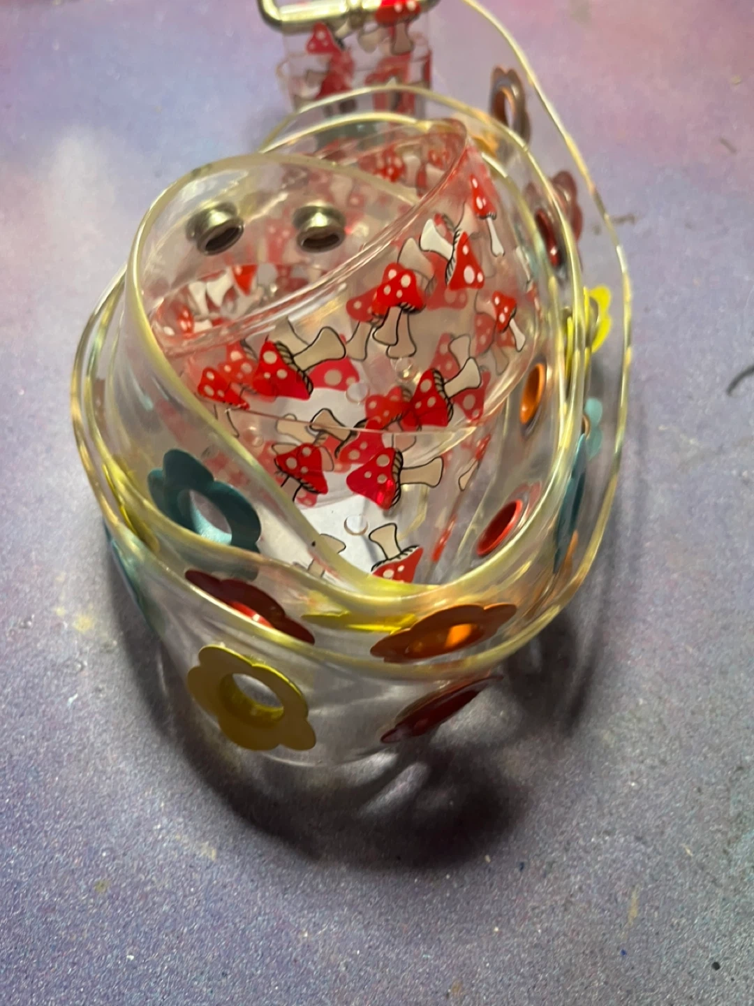 One black faux leather belt with a hammered gold heart buckle. A second clear vinyl belt is included, decorated with red and white mushrooms and colourful flower details. These belts add a fun flair to any outfit!