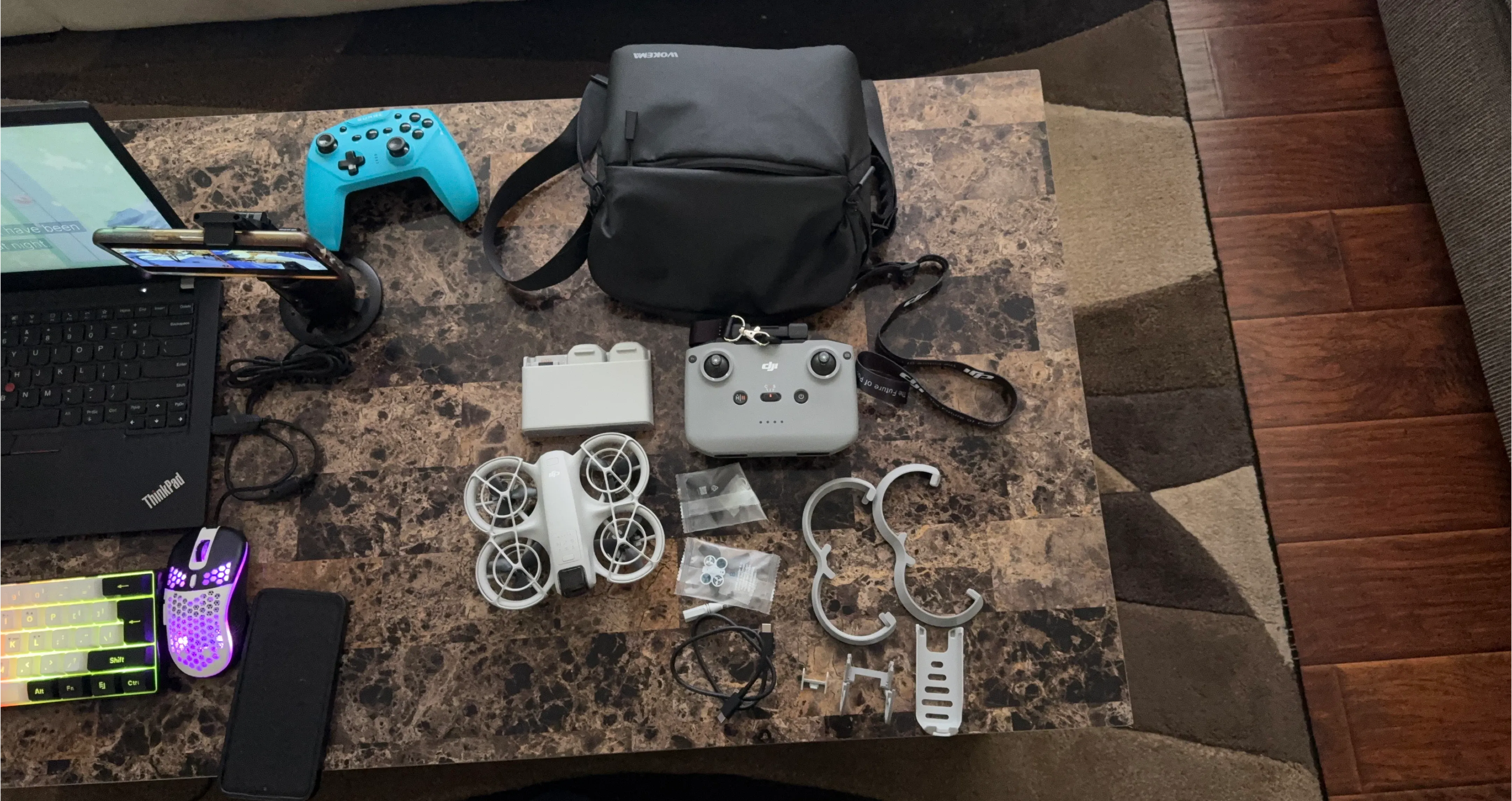 DJI Neo drone package. Includes the drone, controller, charging hub, propellers, and a carrying bag. It's a compact and capable drone for aerial photography. This kit is perfect for beginners looking to get into drone flying!