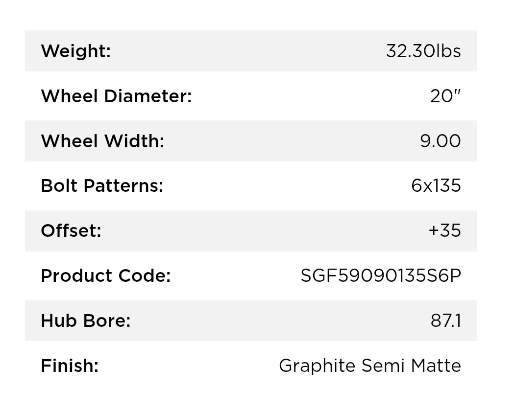 20"by 9", 6×135 (6×5.3") bolt pattern, +35 offset, 87.1mm hub, graphite semi matte finish. Fits lots of trucks.