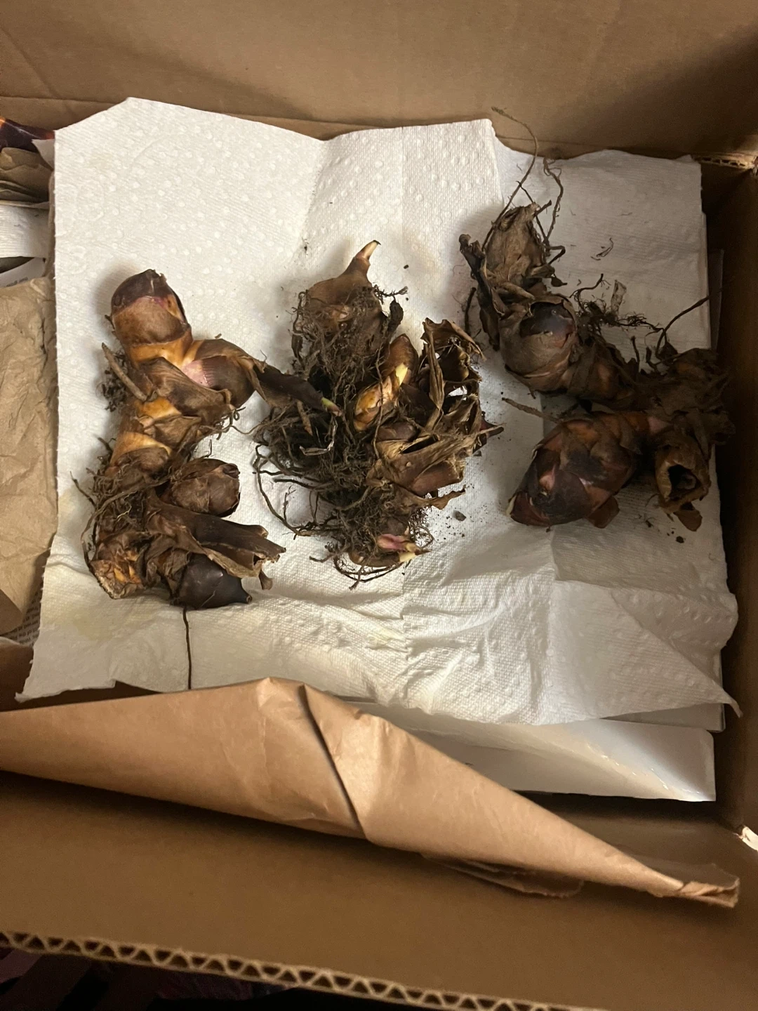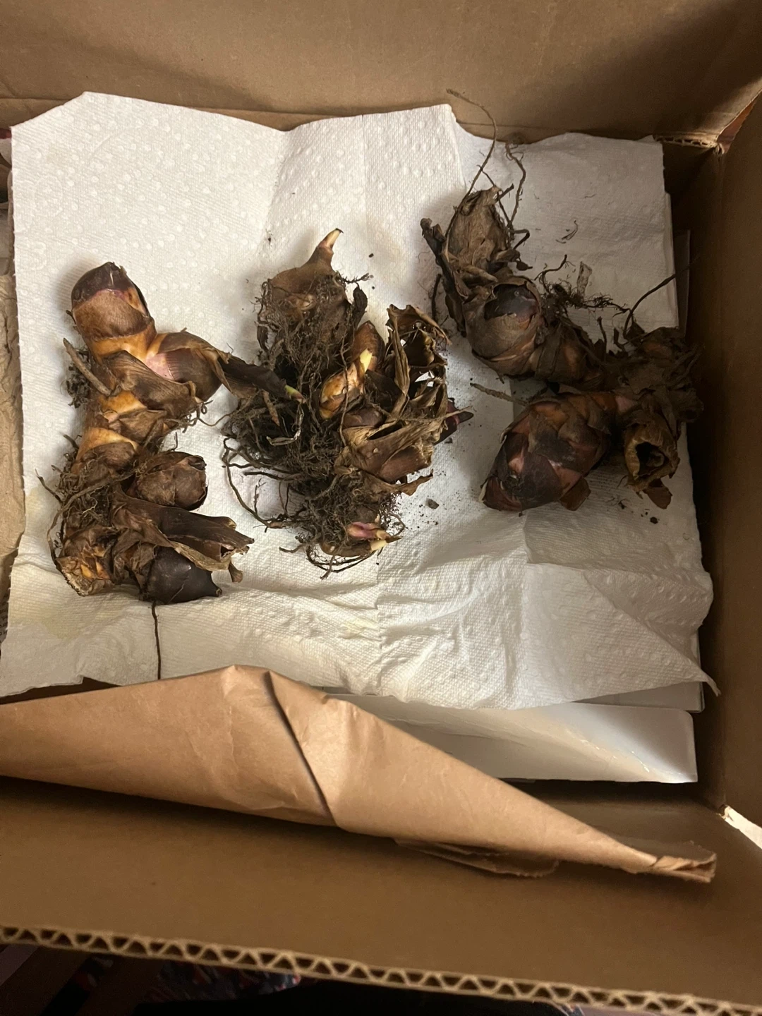 Four Canna Lily bulbs, ready for planting. These will grow into vibrant red flowering plants. They're healthy and have been stored in a cool, dry place.
