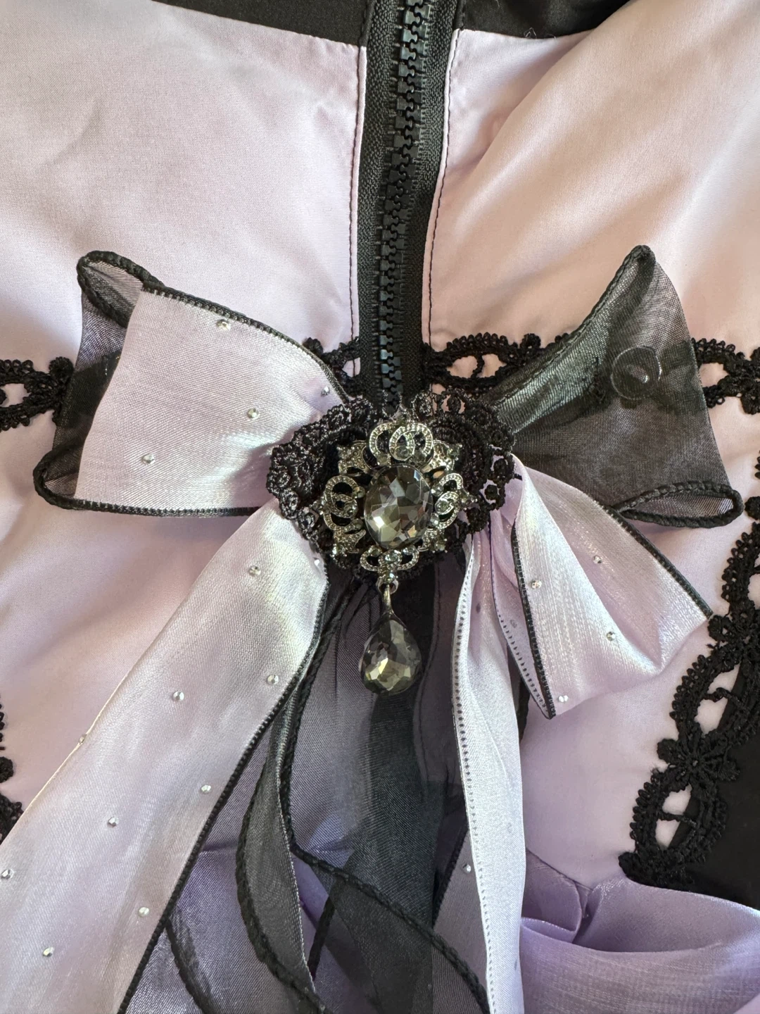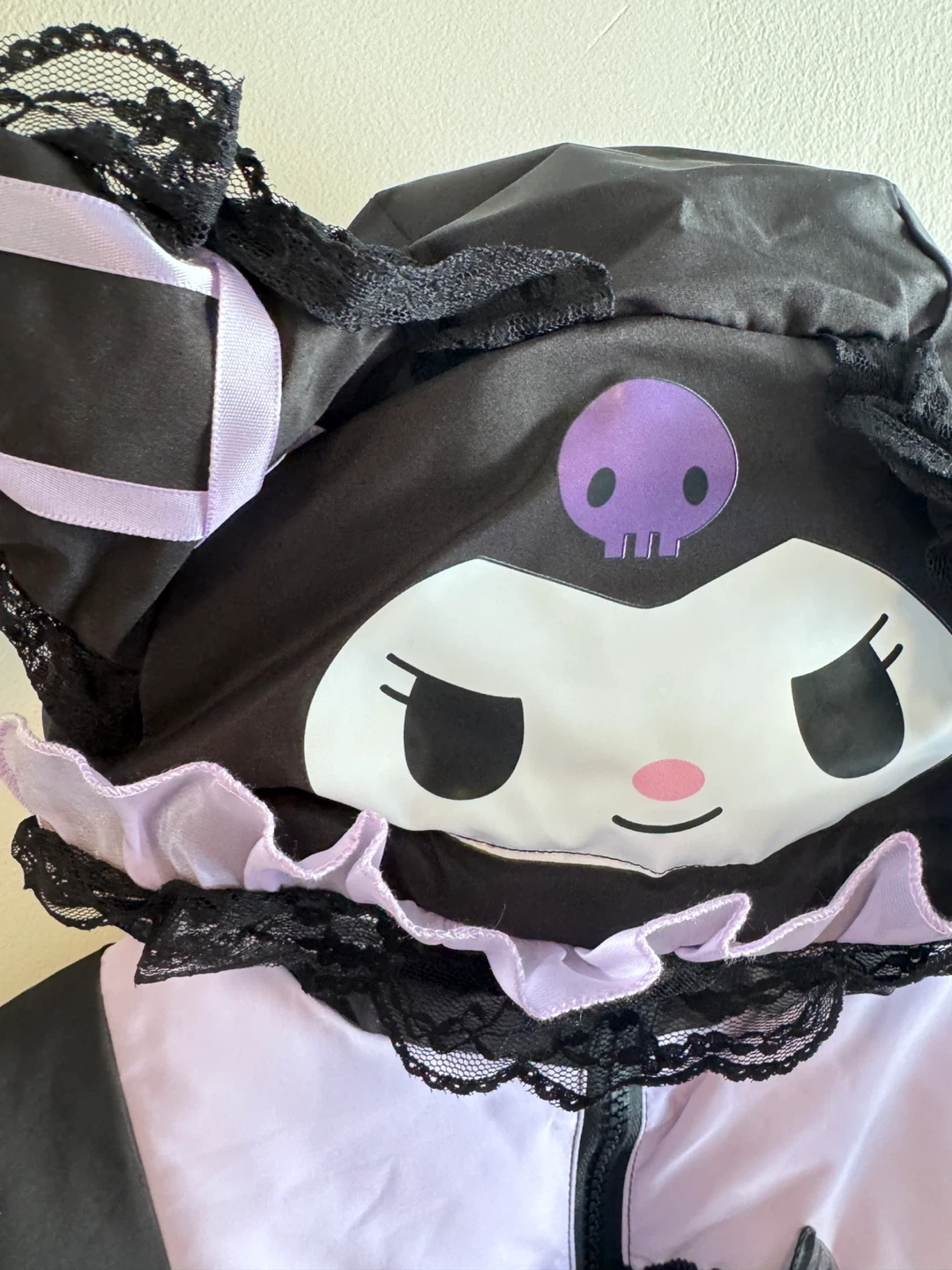 This black and purple puffer jacket features a Kuromi character design with ruffles and lace trim. It has a zip-up front and a hood. The jacket is made of polyester with a satin-like sheen on some panels.