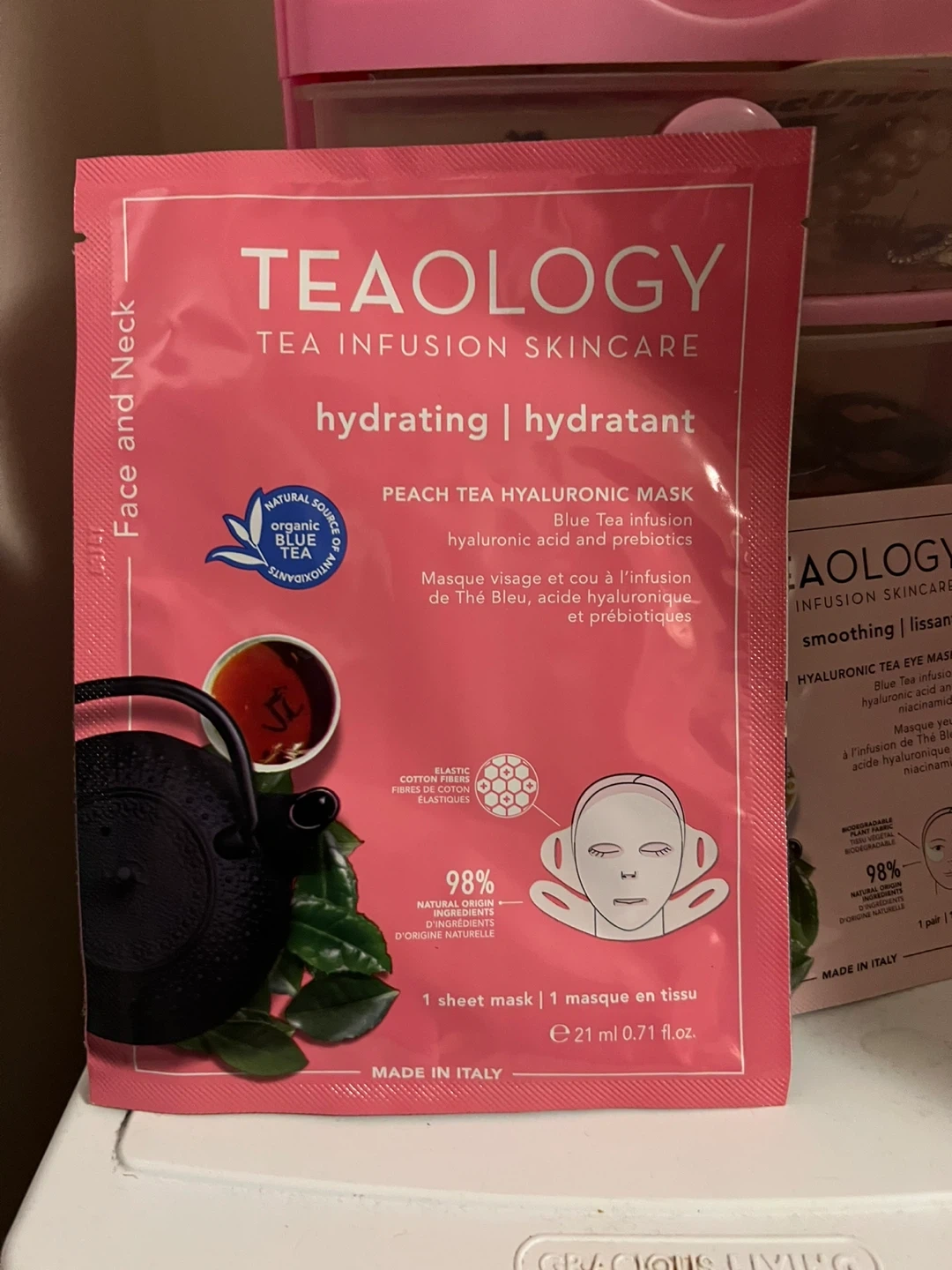 This hydrating face and neck mask uses organic blue tea infusion, hyaluronic acid, and prebiotics. It's made with 98% natural origin ingredients and a plant-based fabric. Use for 10 to 20 minutes. Great for skin hydration!