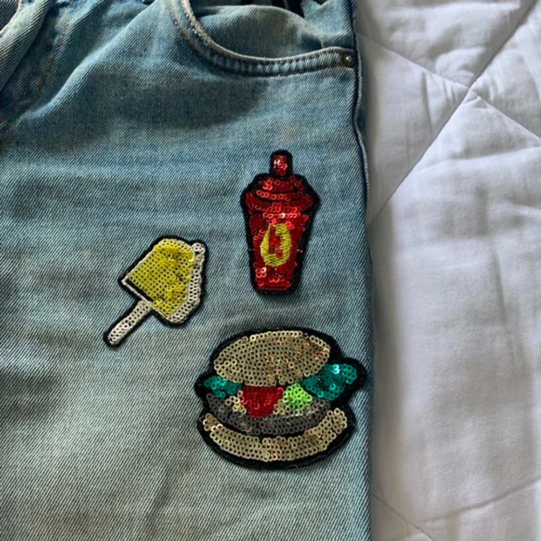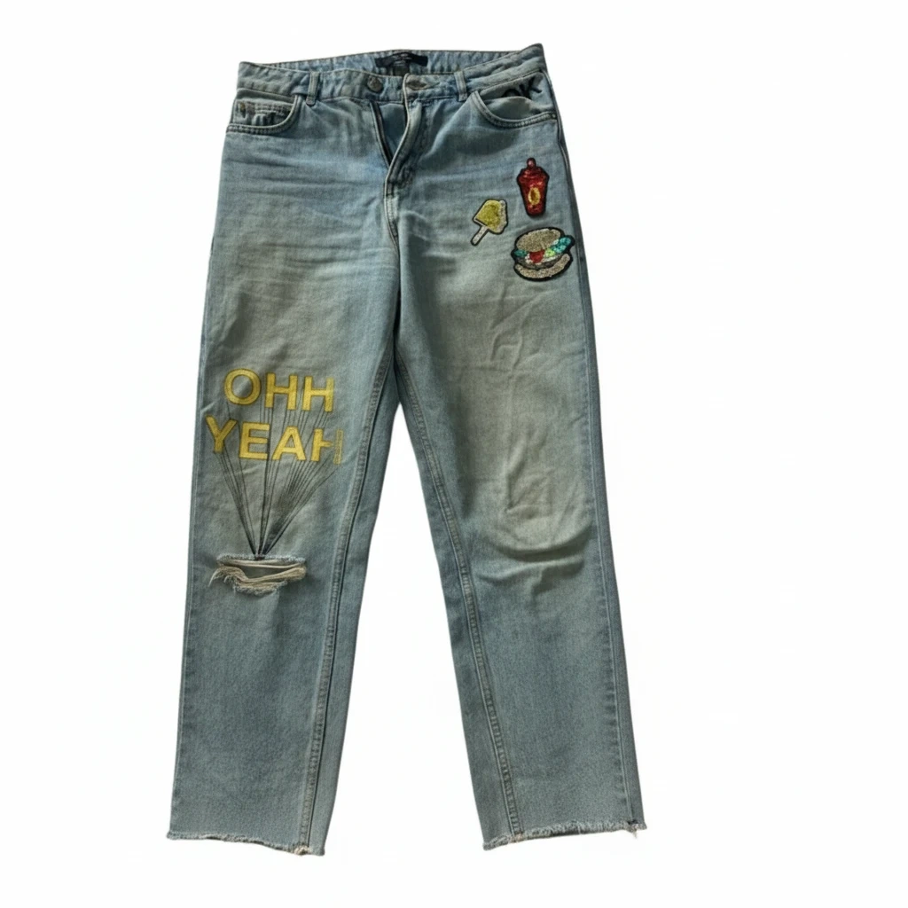 Zara light wash denim jeans with a "OHH YEAH" graphic and sequined patches of a popsicle, soda, and burger. These jeans have a comfortable, relaxed fit.