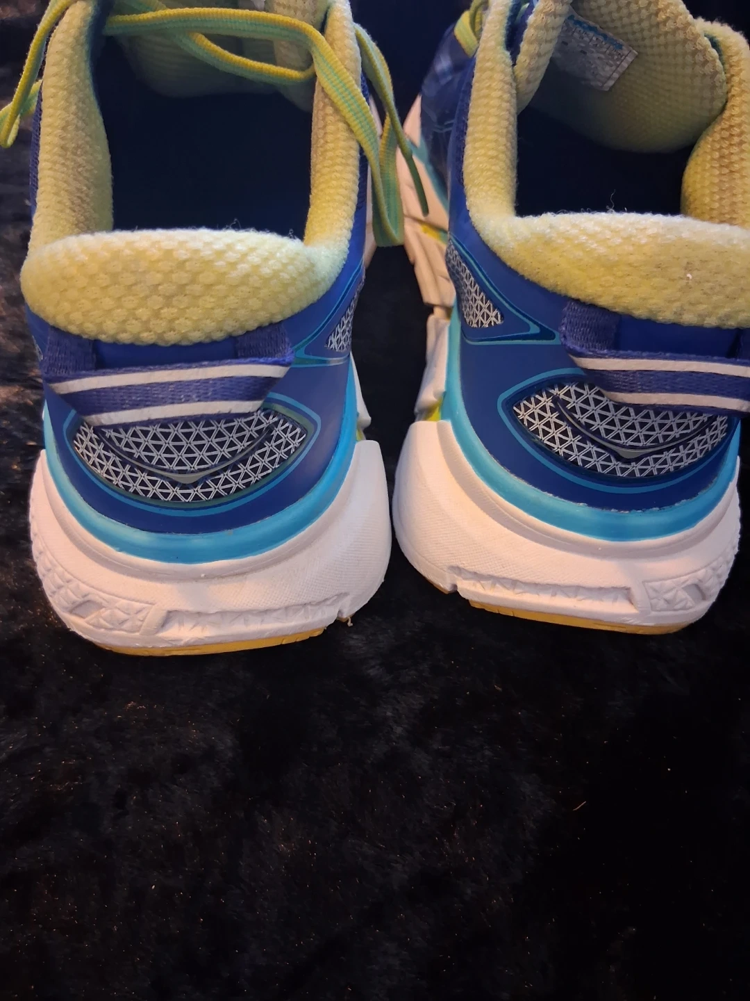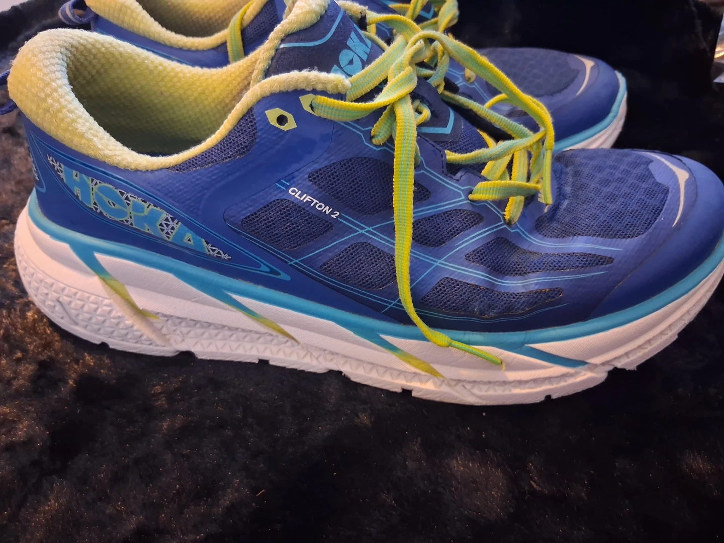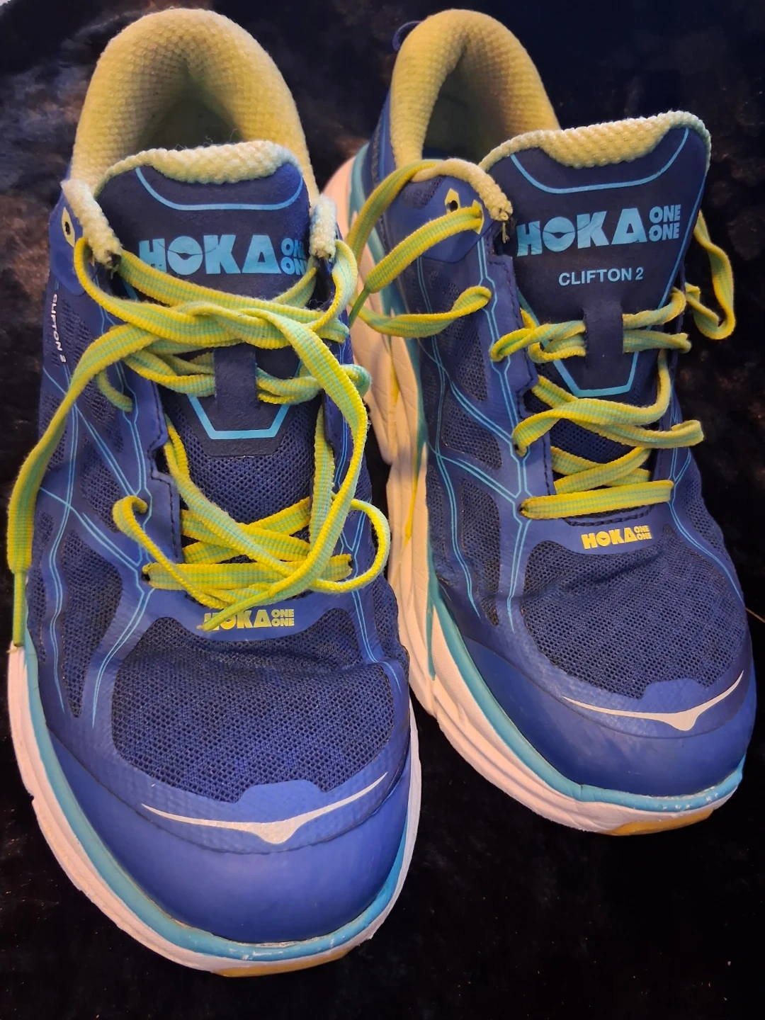 These Hoka One One Clifton 2 running shoes are blue and yellow. They're designed for athletic performance. Mesh upper and cushioned sole.Size us 9.5