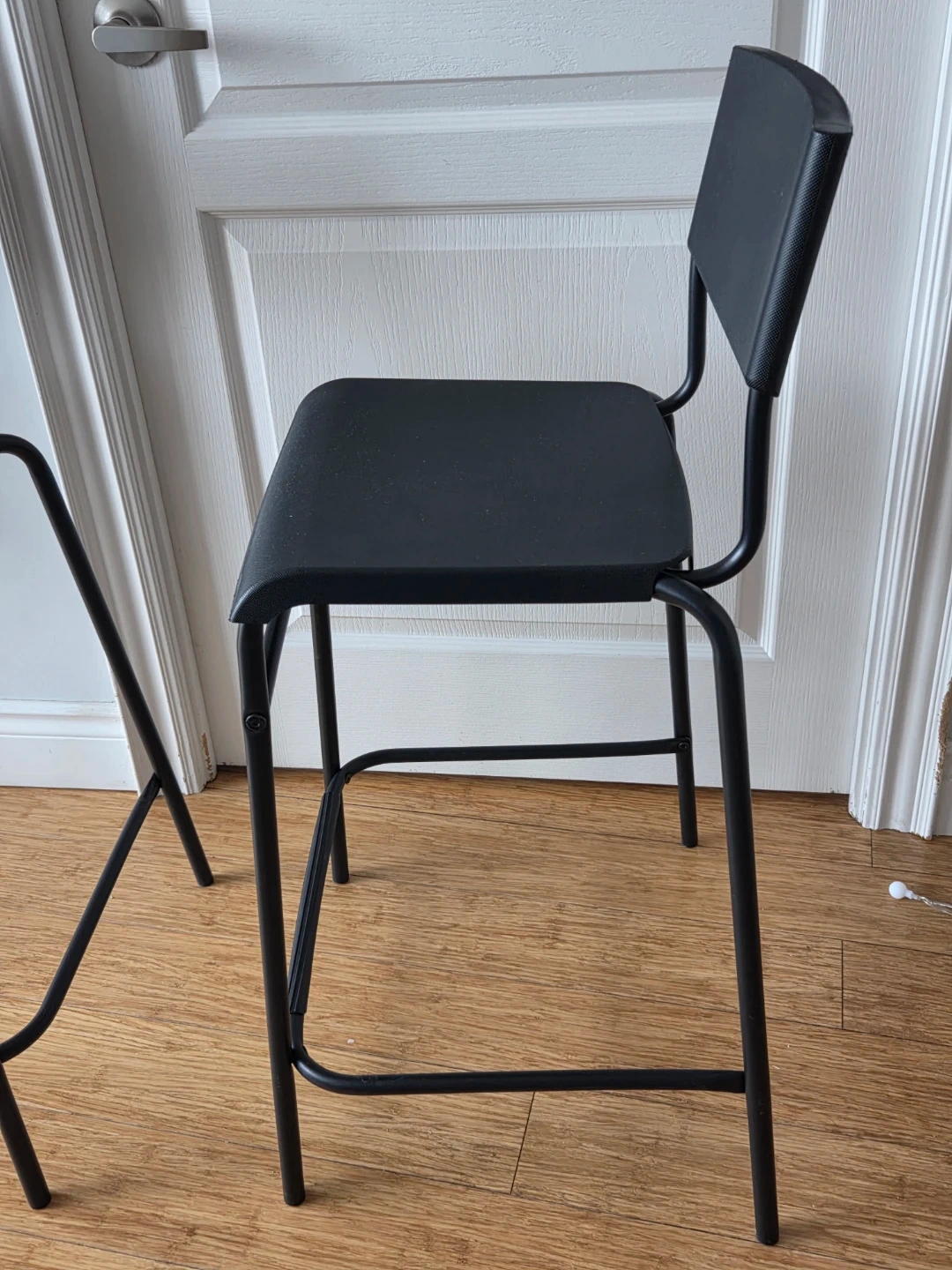 These black bar stools are sturdy and stackable. They have a metal frame and a plastic seat and back. Seat height is 63 cm (24 3/4").