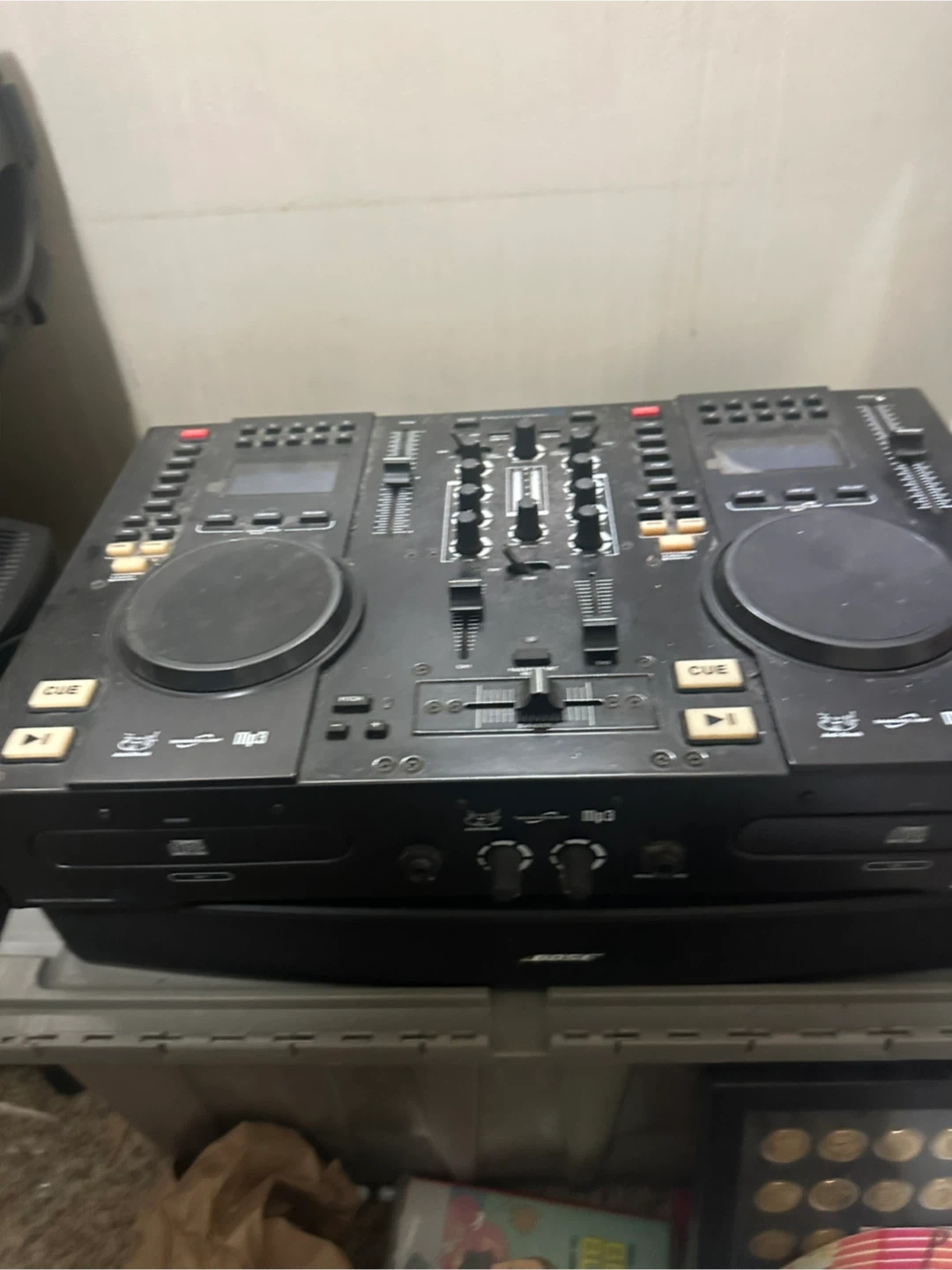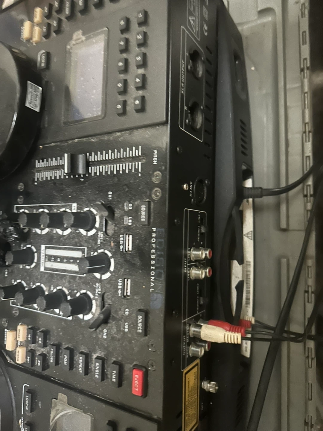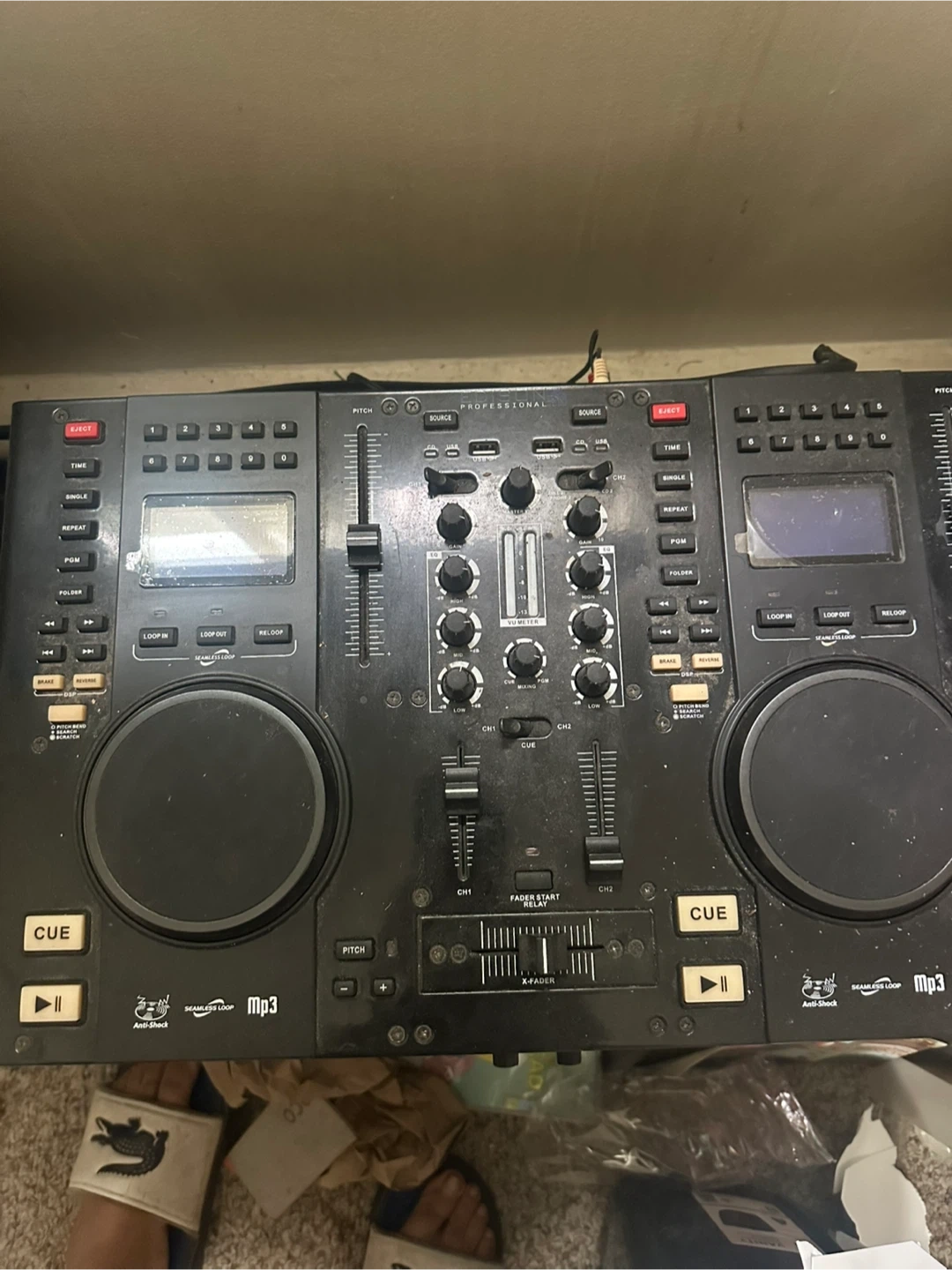 Numark 4Trak DJ controller with four decks. It has USB and CD inputs. Features include beat-looping and echo effects. Great for aspiring DJs!