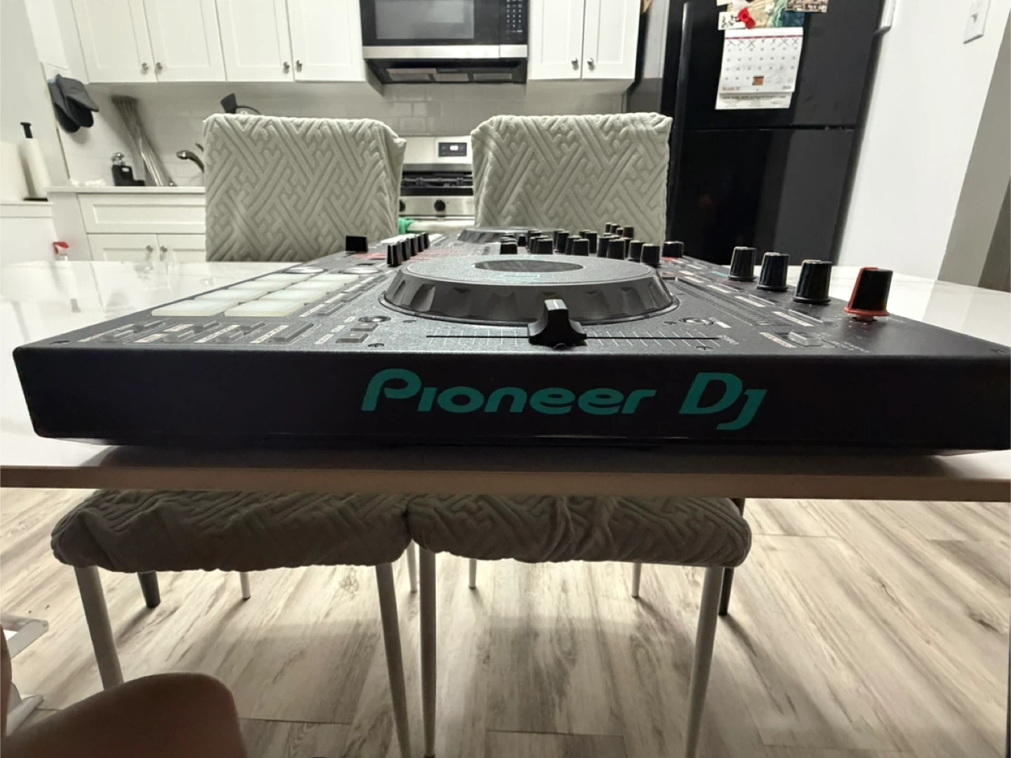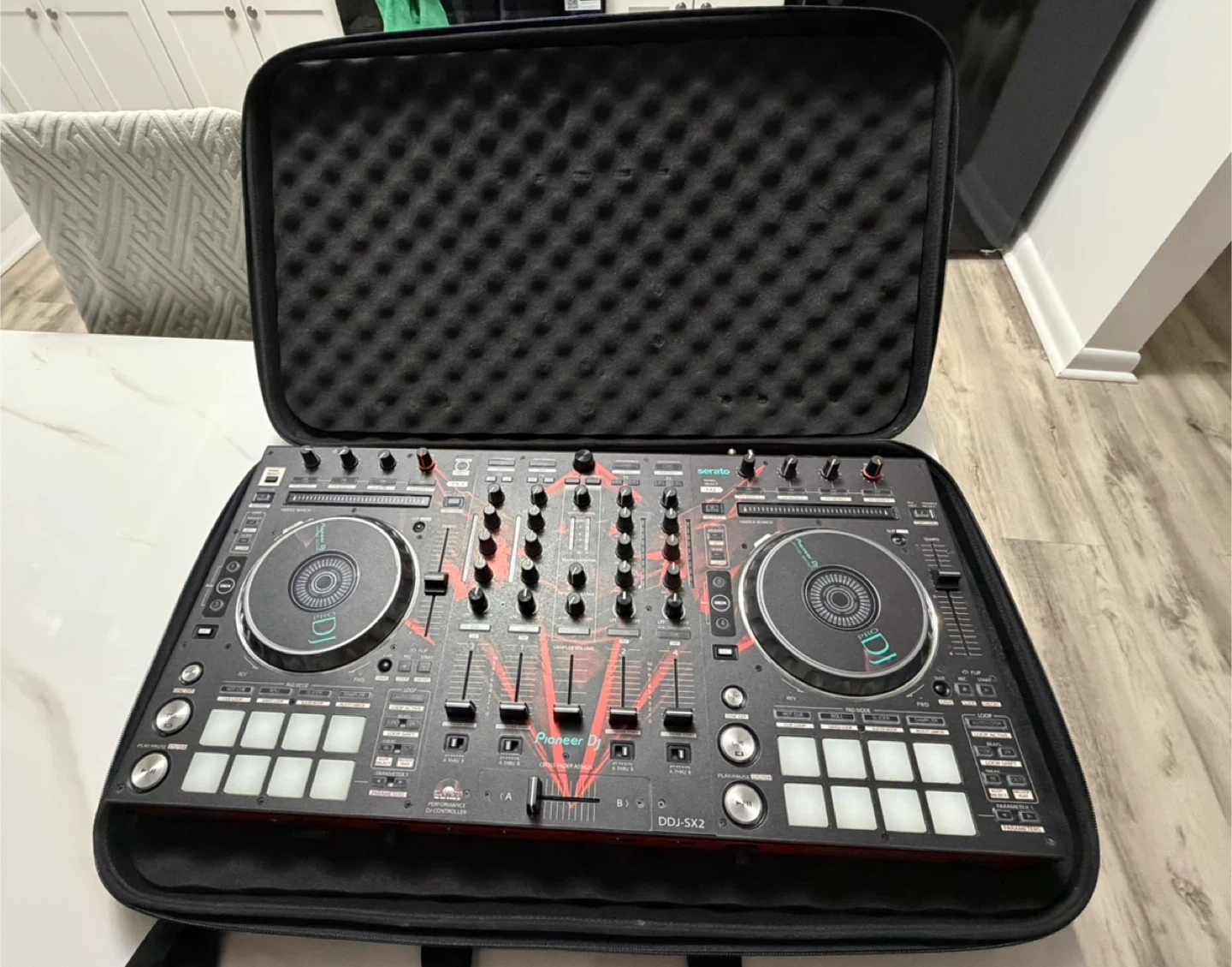 This is a Pioneer DJ DDJ-SX2 controller, used for DJing. It's compatible with Serato software and Virtual DJ .Includes a sturdy case for transport. All buttons, jog wheels, and faders are present and appear functional. With charger cable..
