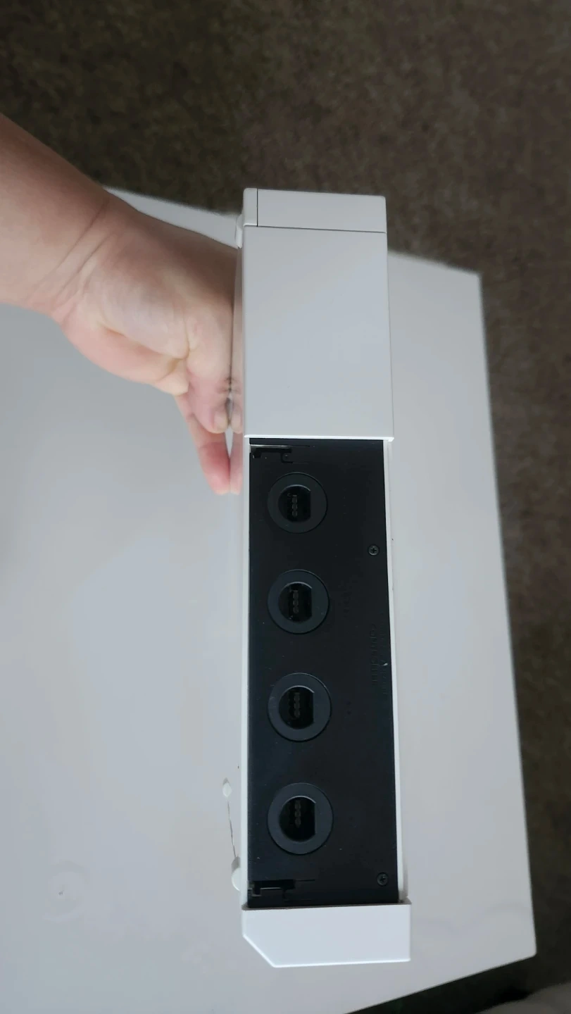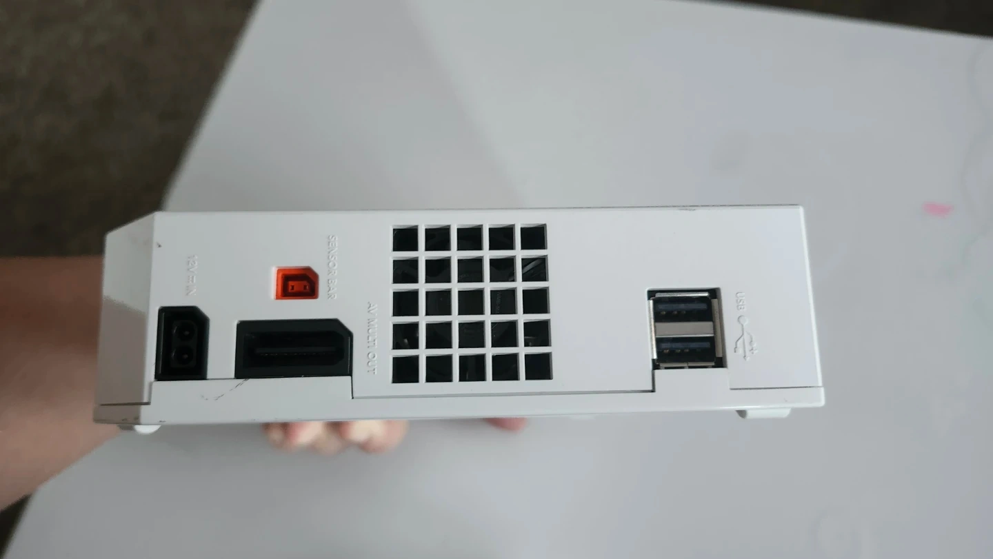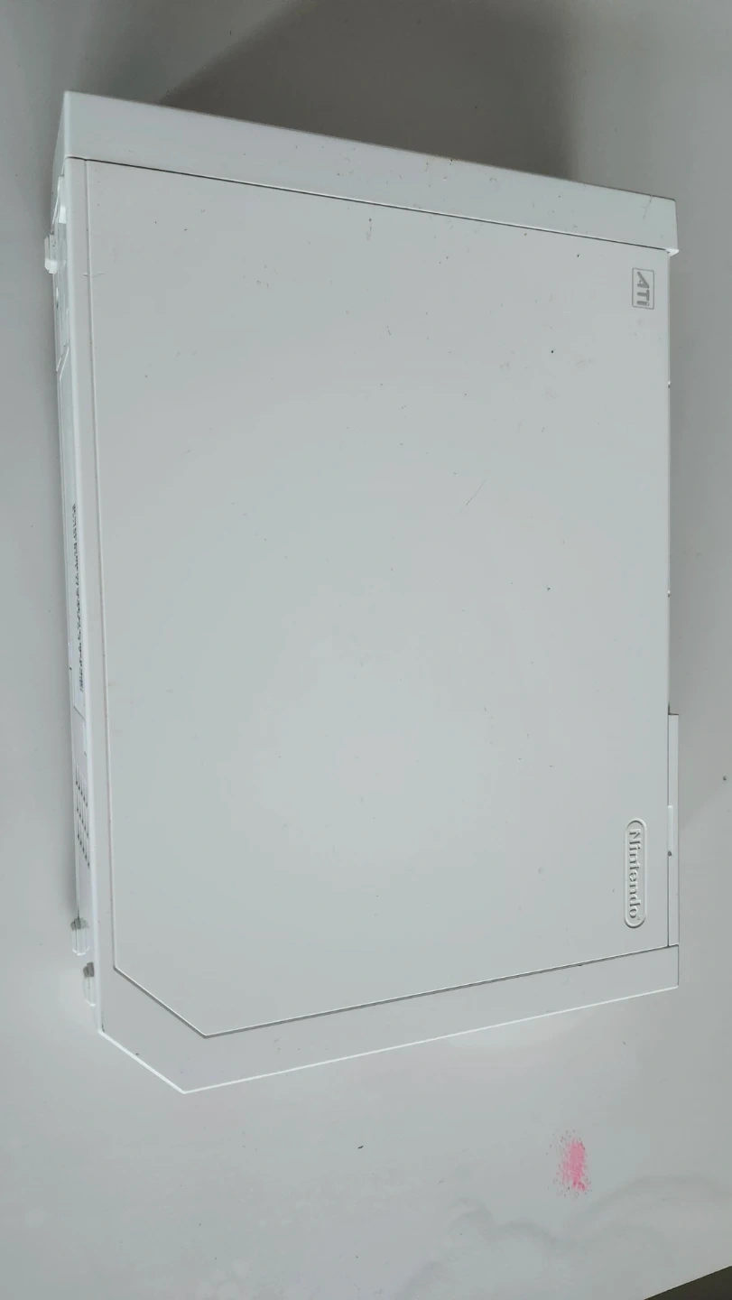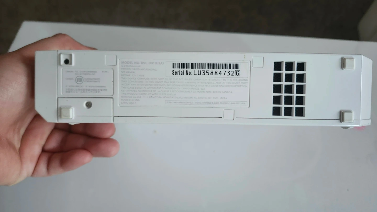 This is a white Nintendo Wii console, model RVL-001. It comes with four GameCube controller ports.