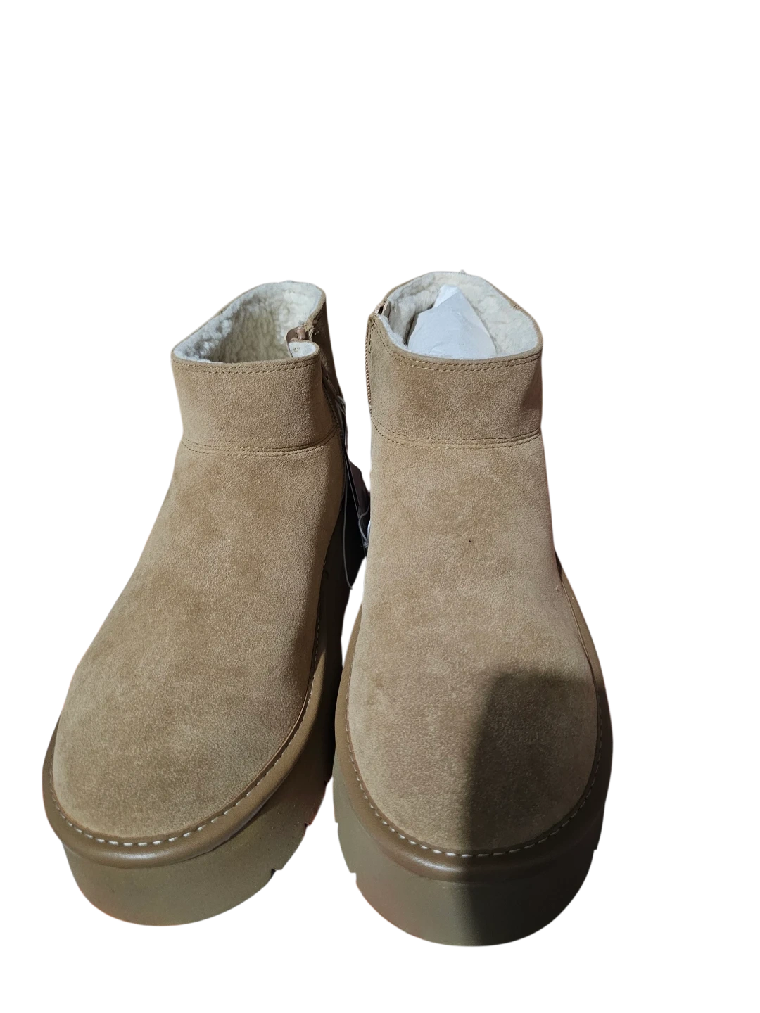 New size 9 Cozy tan suede winter boots with a plush lining and a convenient side zipper. They feature a chunky platform sole for added style and comfort. The material is suede with a faux fur lining.