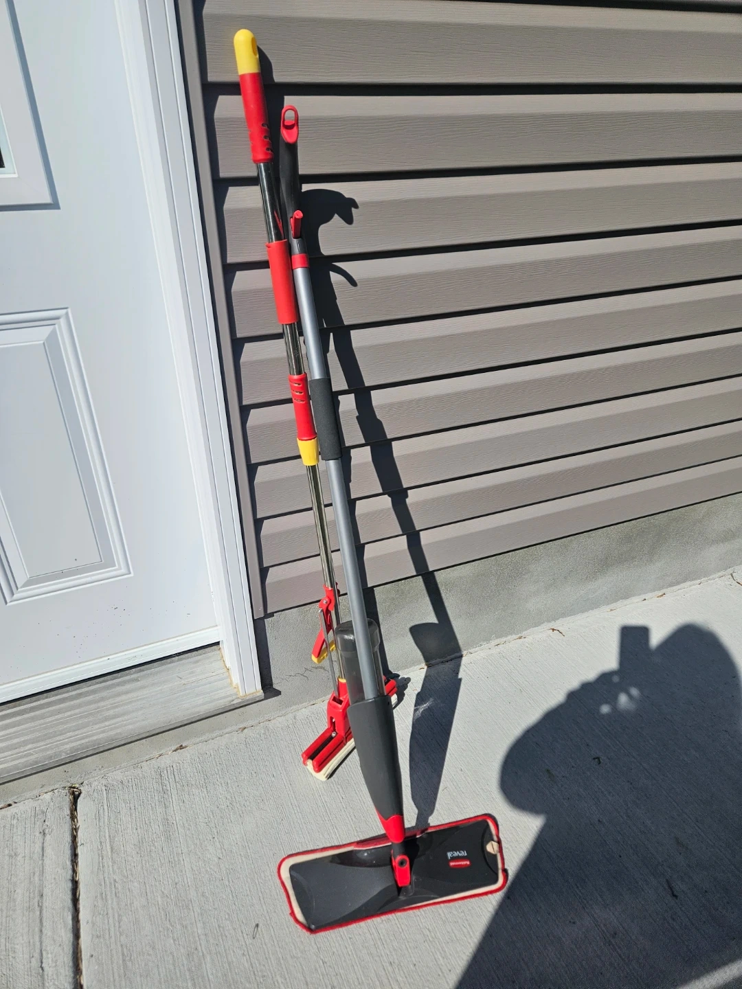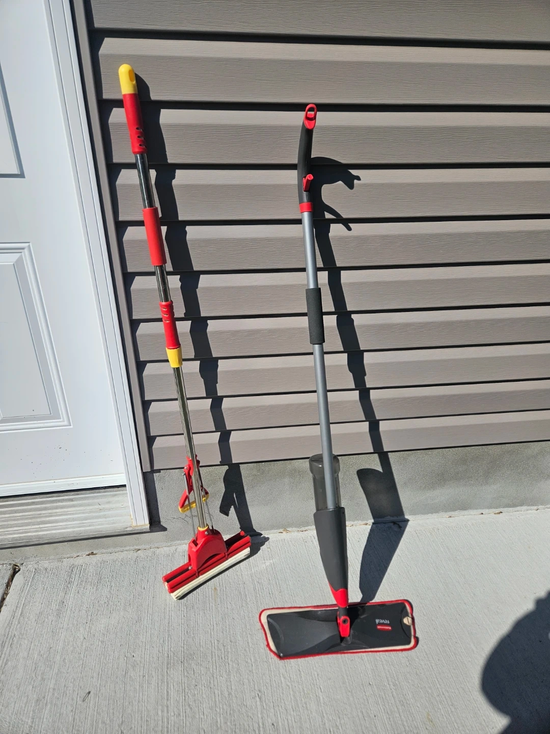 Includes a spray mop with a refillable bottle for cleaning solution and a traditional mop with a scrub brush. Both have red and grey handles. Ready for cleaning tasks!