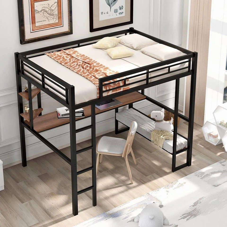 Full Size Loft Bed with Desk & Shelves – Metal Frame