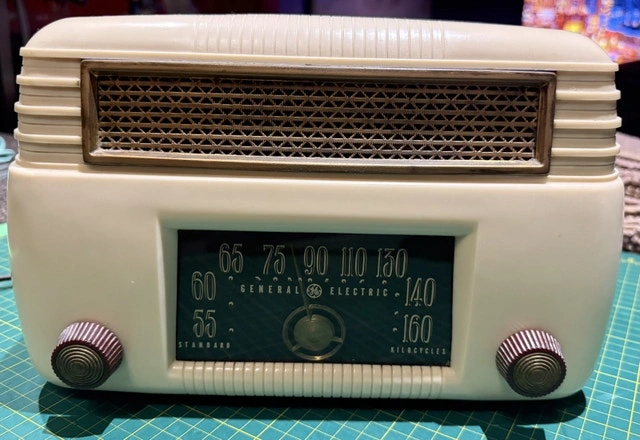 1948 General Electric radio model 201. AM reception, 6 tubes. The casing is in excellent condition, with no cracks or chips, and has a nice shine. Excellent glass sphere cover, original knobs, original power cord. Perfect working condition. Last picture is one on Etsy currently selling for over $300