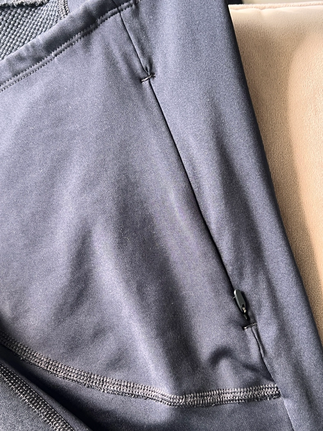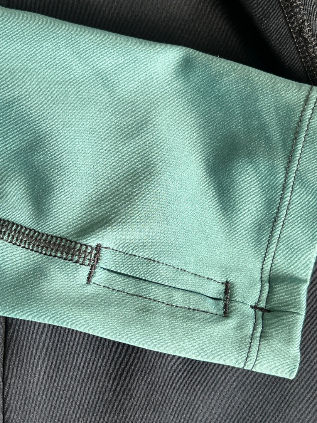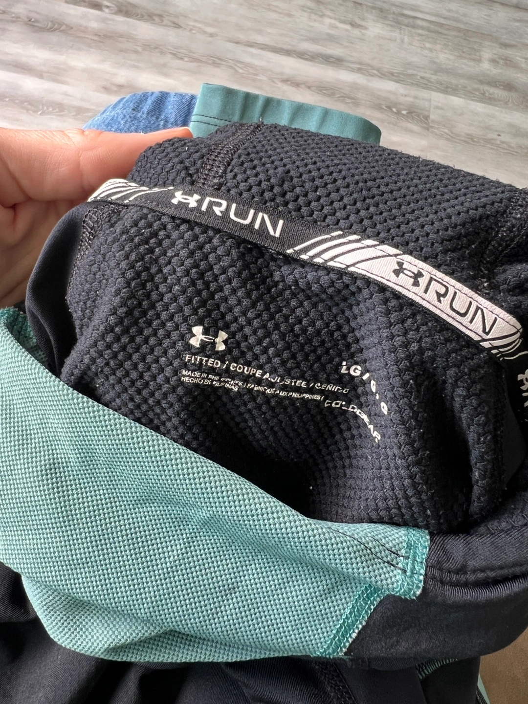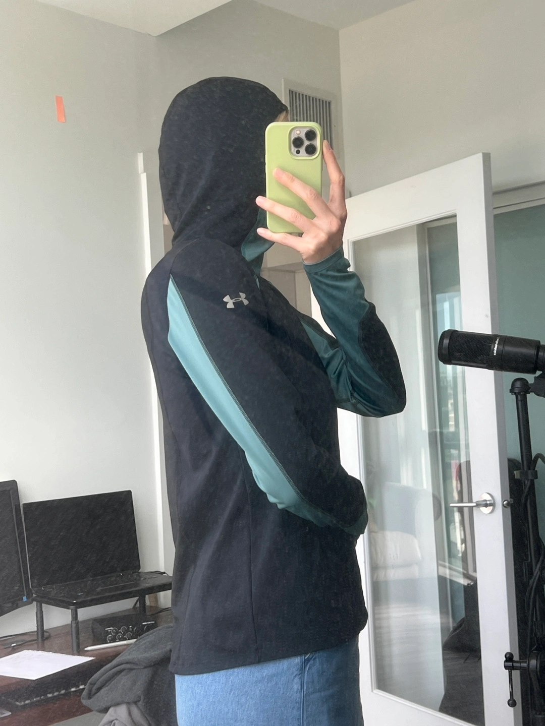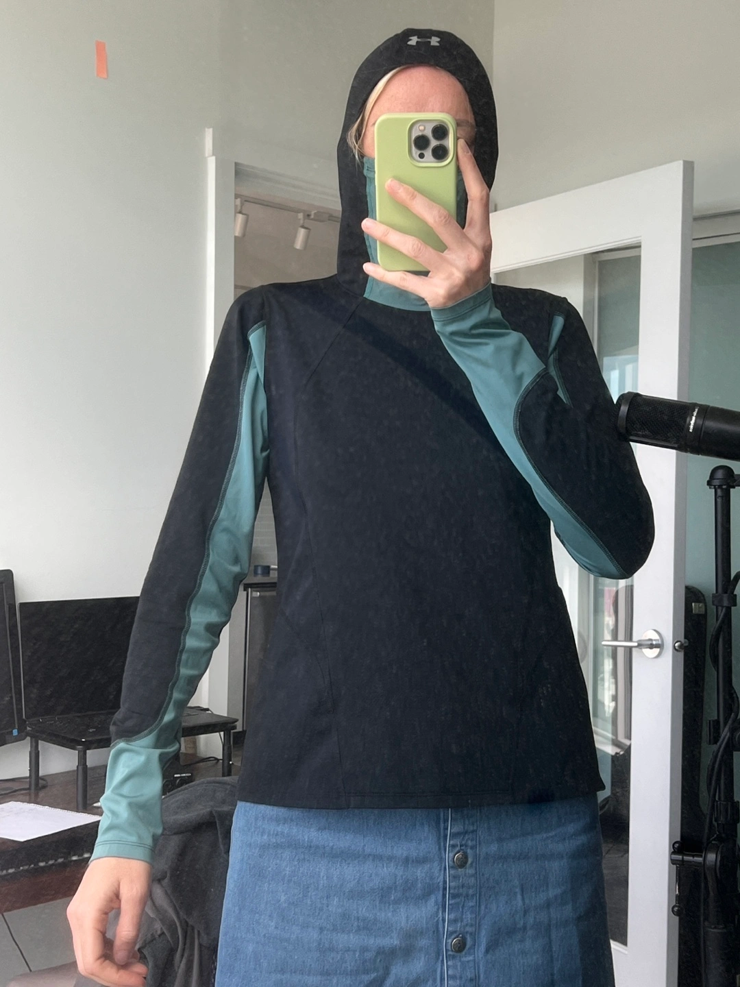 Under Armour women's running hoodie. Size large. Black and teal. Fitted. Features a hood and thumbholes. Small zippered pocket.
