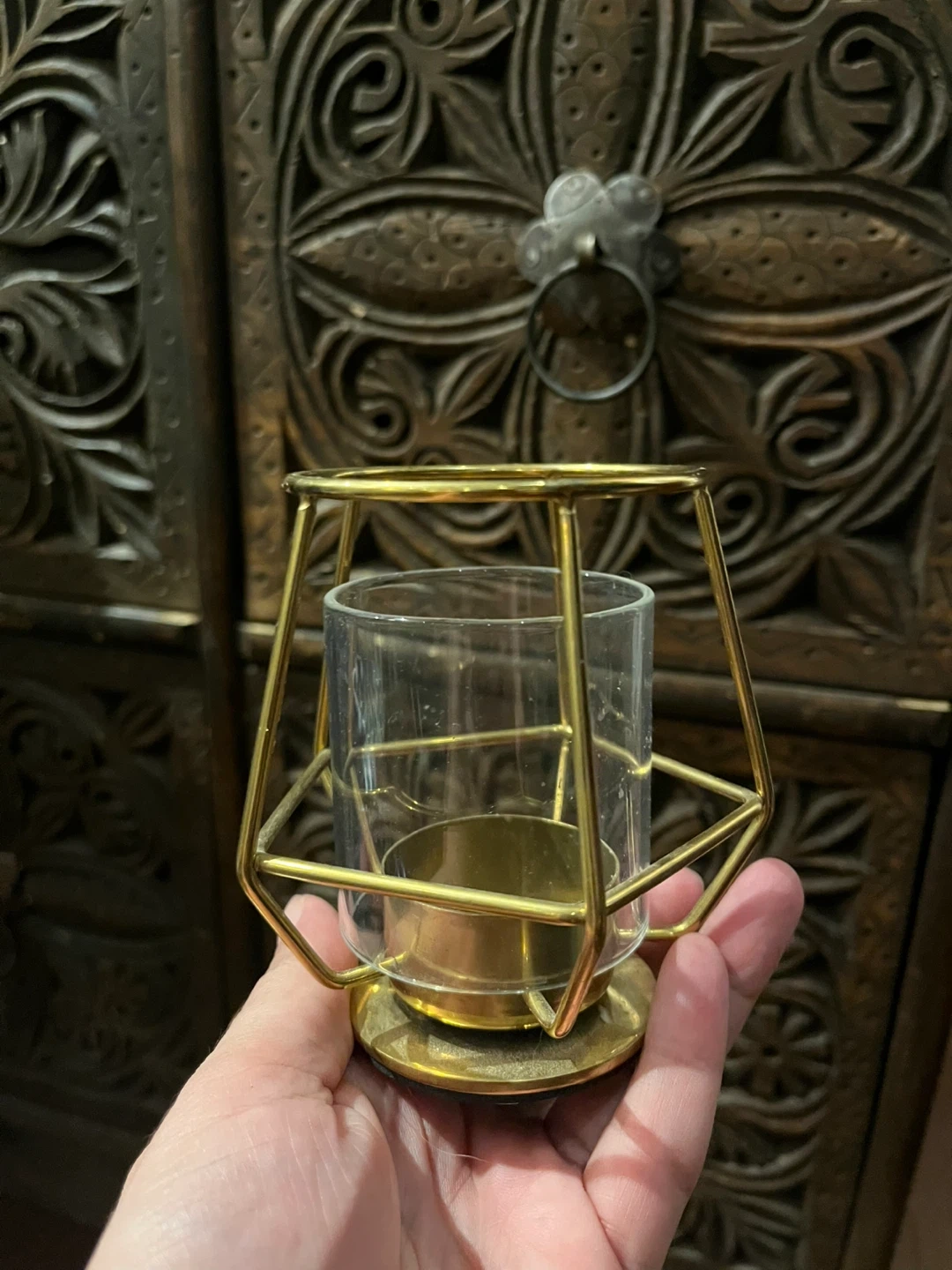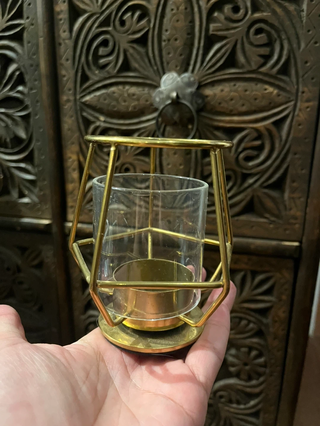 A stylish geometric candle holder with a gold metal frame and a clear glass insert. It's designed to hold a tea light or small votive candle. This holder adds a modern touch to any table or shelf.