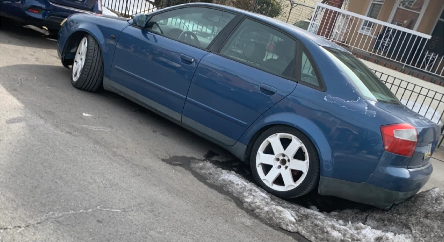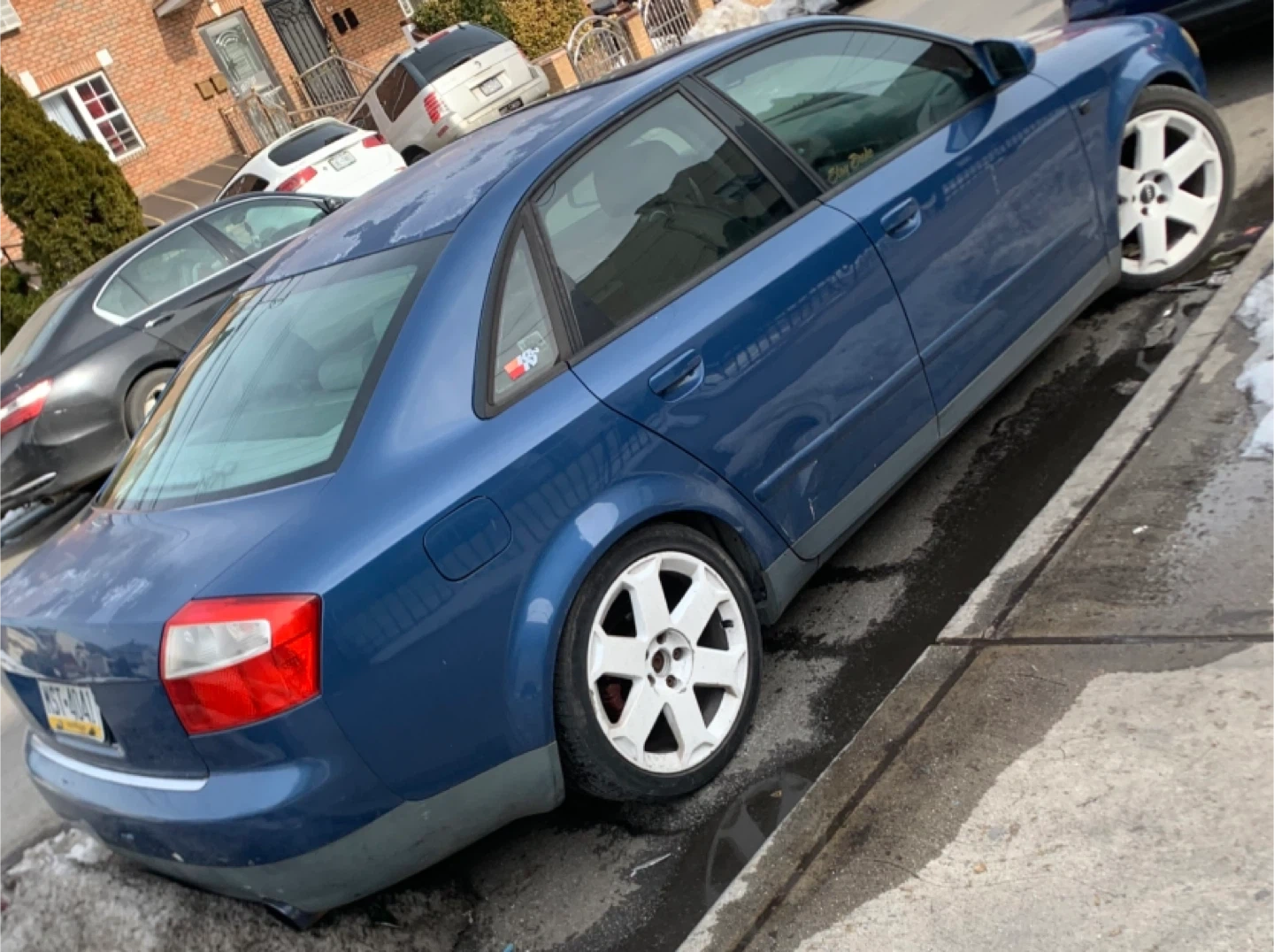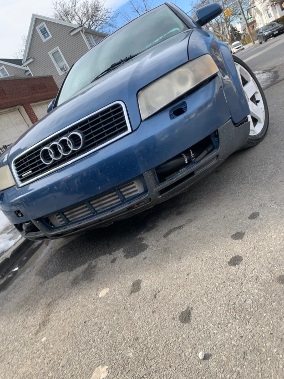 This is a blue Audi A4 sedan with a manual transmission. It has leather interior and white aftermarket wheels. The engine bay shows aftermarket modifications. B6 02 1.8t 5spd manual