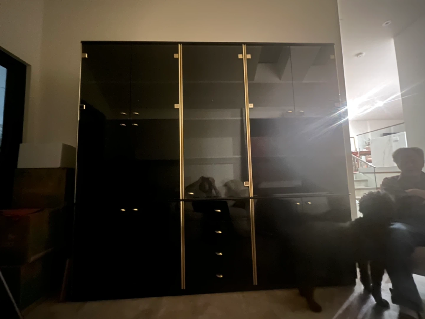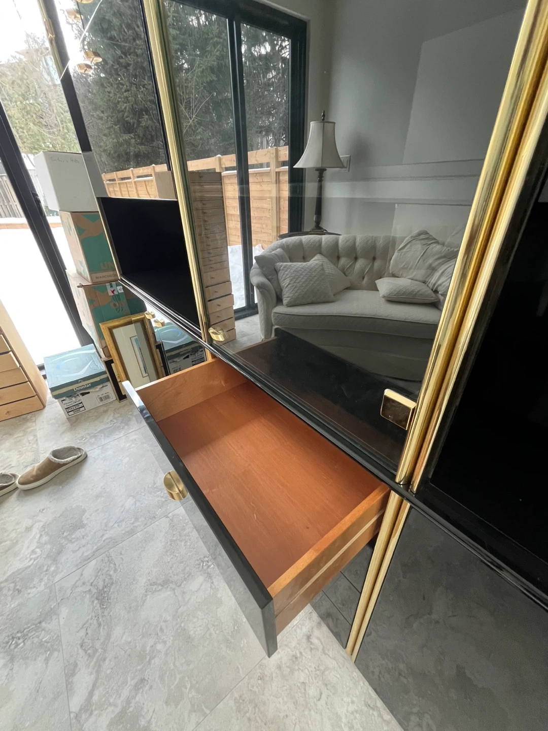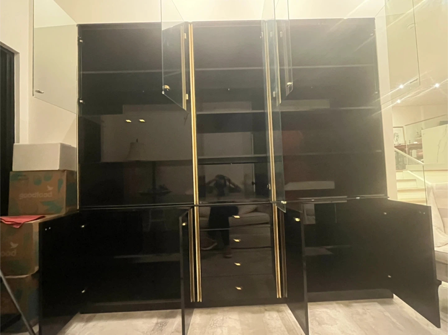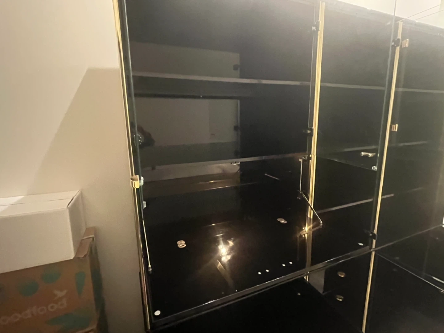 Spacious black lacquer display cabinet with glass doors and gold accents. It features multiple shelves for display and drawers/cupboards for storage. Perfect for a living room or dining area. Some interior drawers are visible.