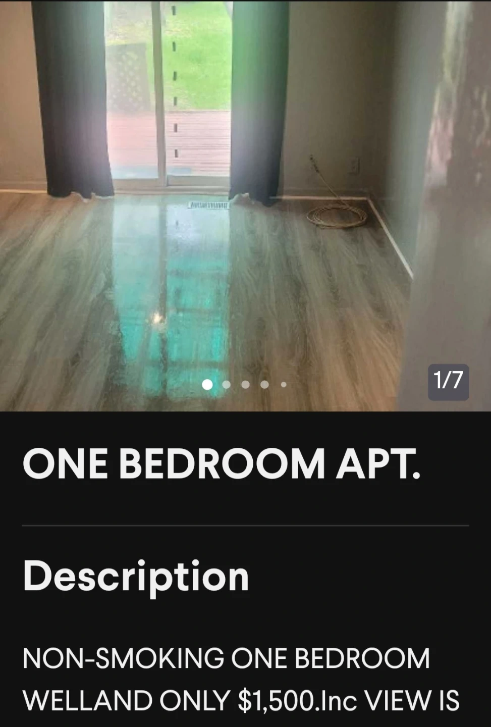 WELLAND ,1,400inc Non-smoking one bedroom apartment available in Welland. Includes a view and a stove. Kitchen has a microwave and fridge included. Floors are laminate. Perfect for a single person or a couple.GREAT LAYOUT PARKING CLOSE TO BUS FOODSTORES LAUNDRY,AVIL TO VIEW NOW dhass907@gmail.com