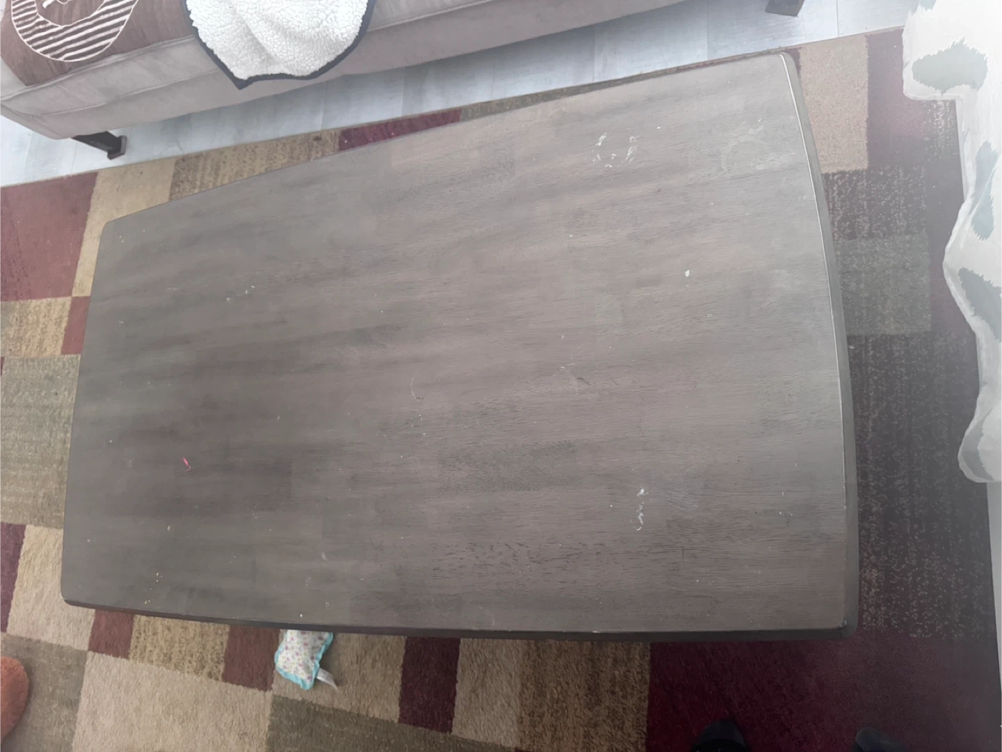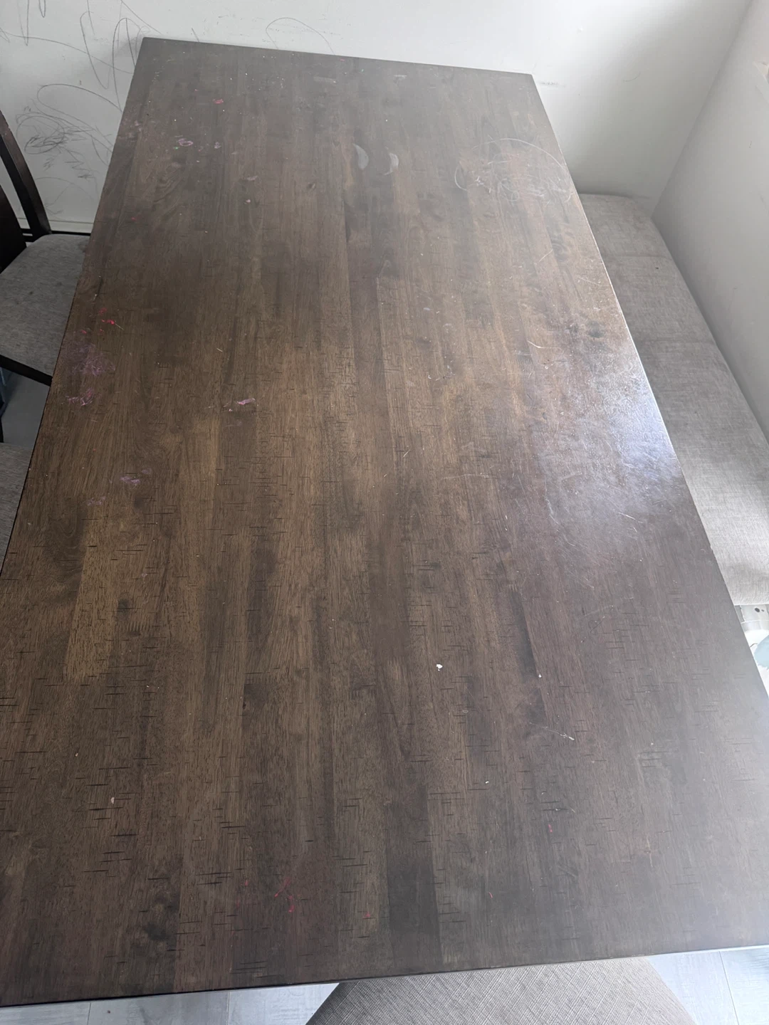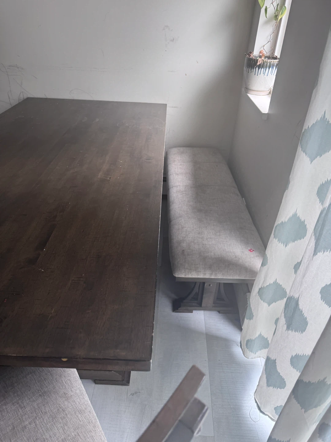 A set featuring a dark wood dining table and a matching coffee table. The dining table is accompanied by upholstered chairs and a bench, providing ample seating. The coffee table includes two drawers for storage. This set offers a cohesive look for your dining and living spaces.