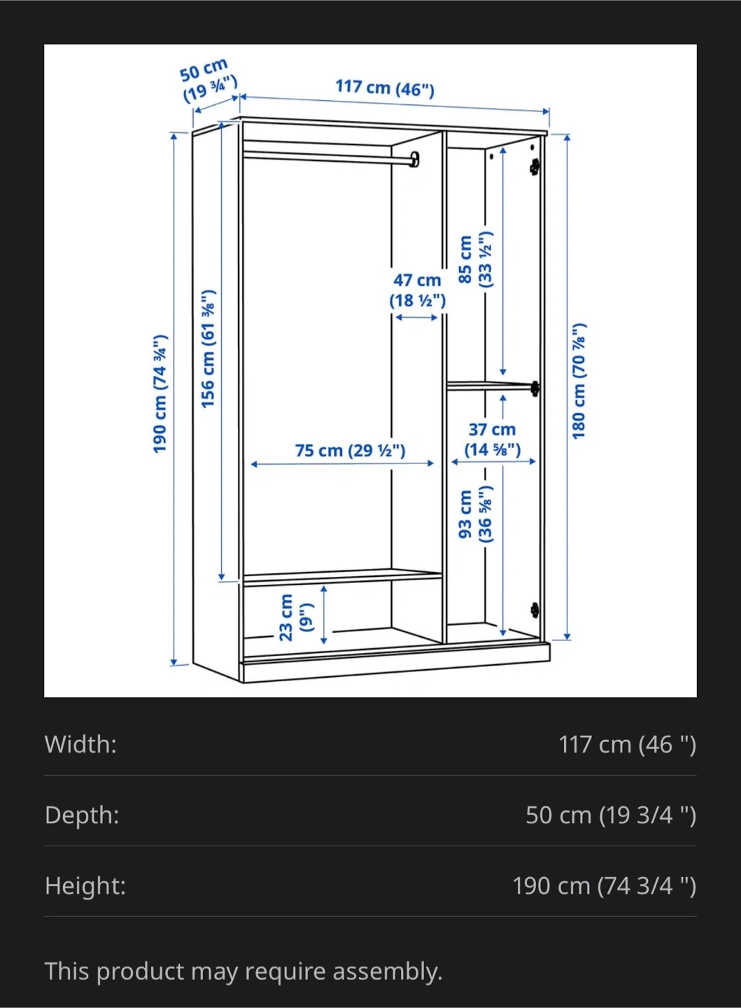 This spacious wardrobe with full length mirror offers ample storage with a hanging rail and multiple shelves. It's black, measuring 117 cm wide, 50 cm deep, and 190 cm high. This unit would be useful for organizing clothing and accessories in any bedroom.