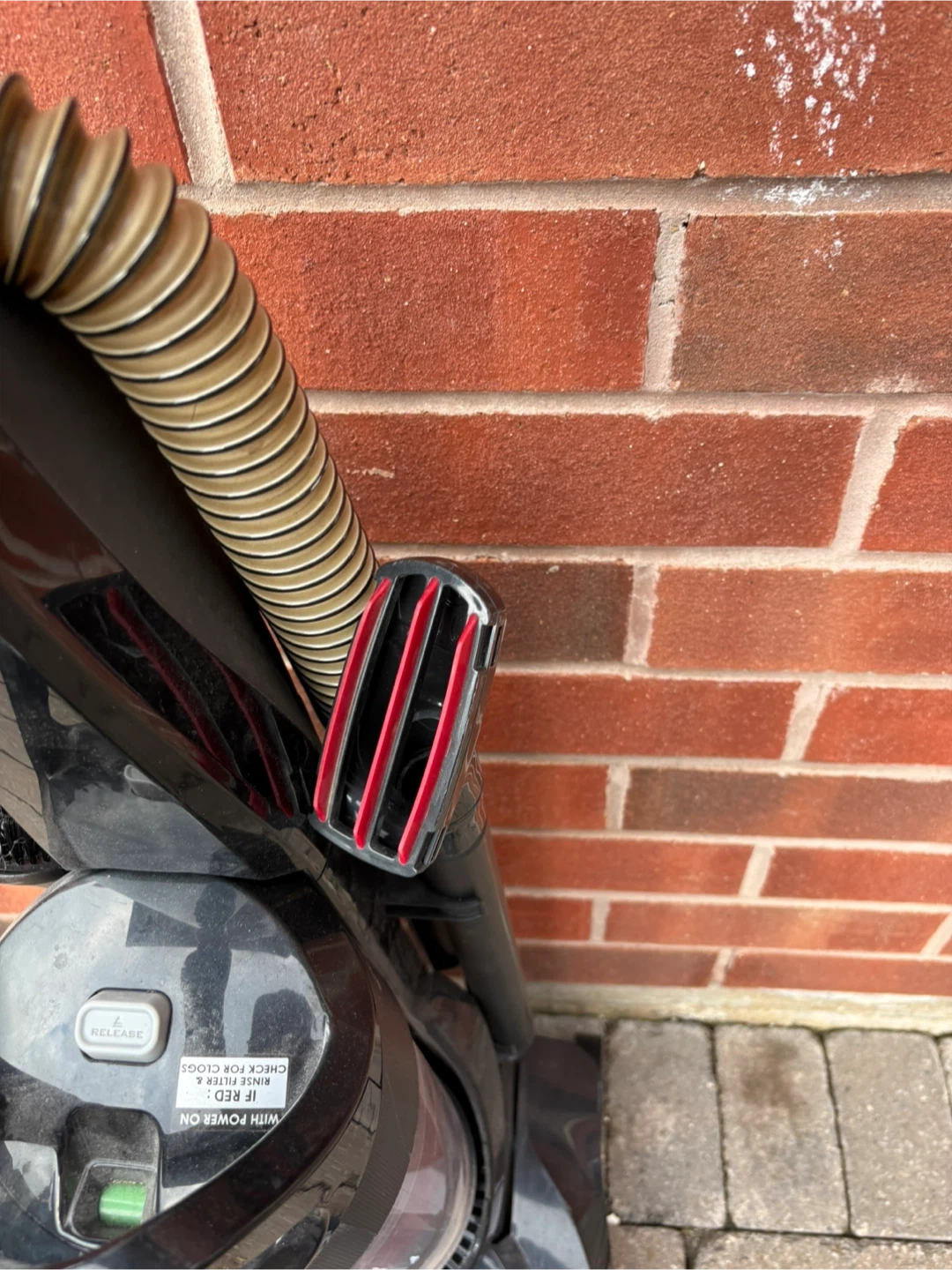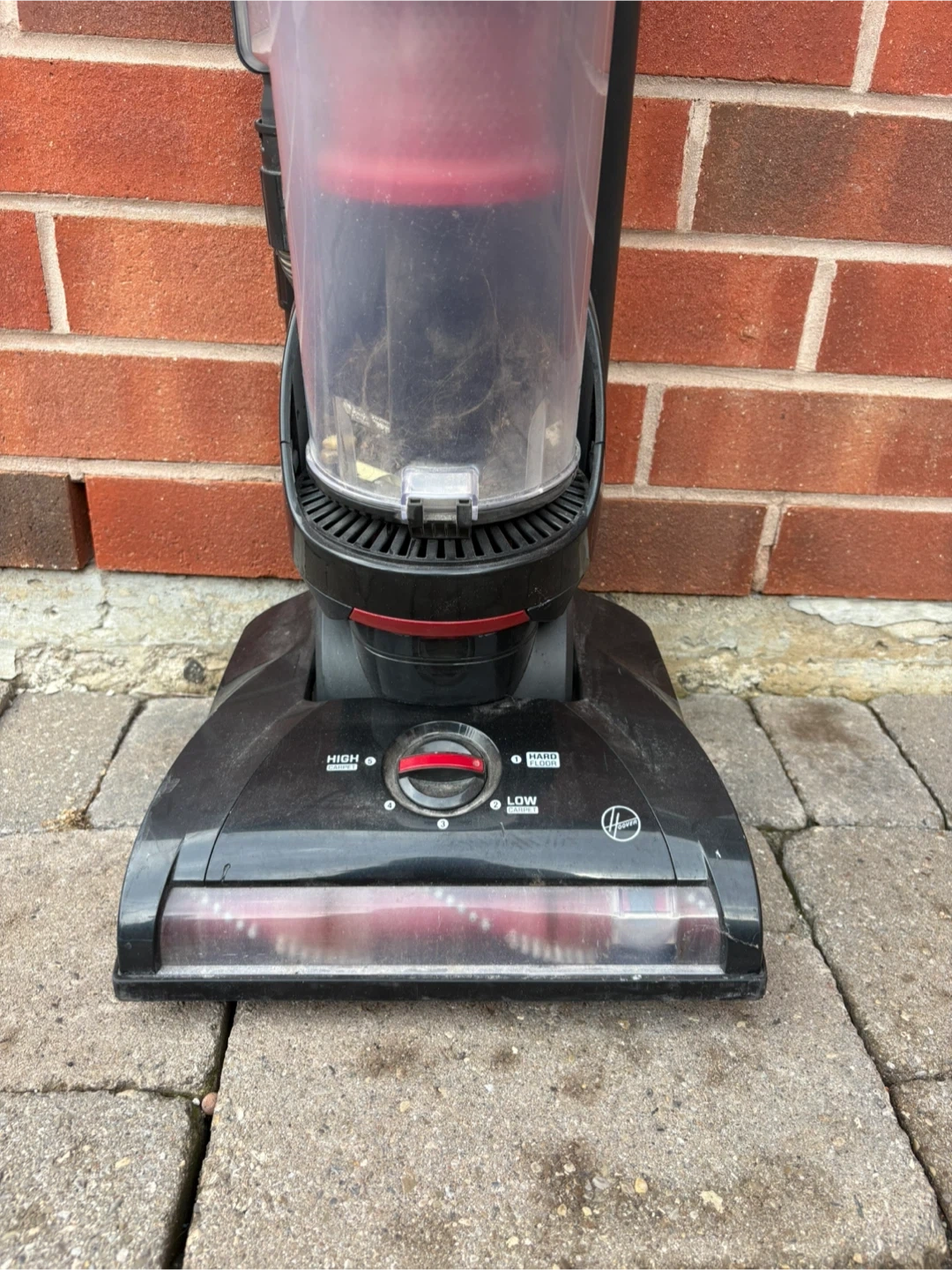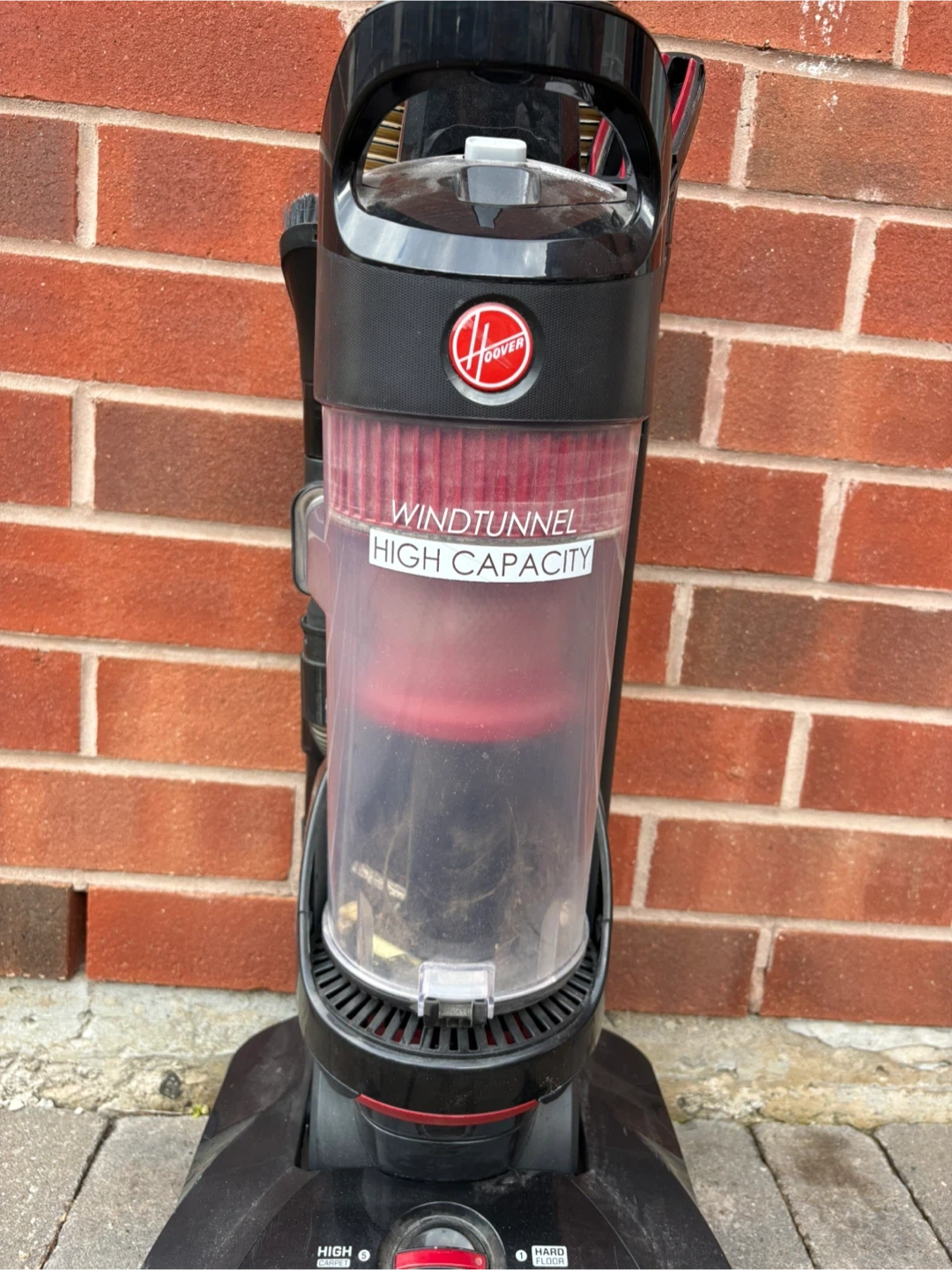 This is a Hoover WindTunnel upright vacuum cleaner with high capacity. It's black and features a clear dirt canister. Settings include high and low pile carpet modes.