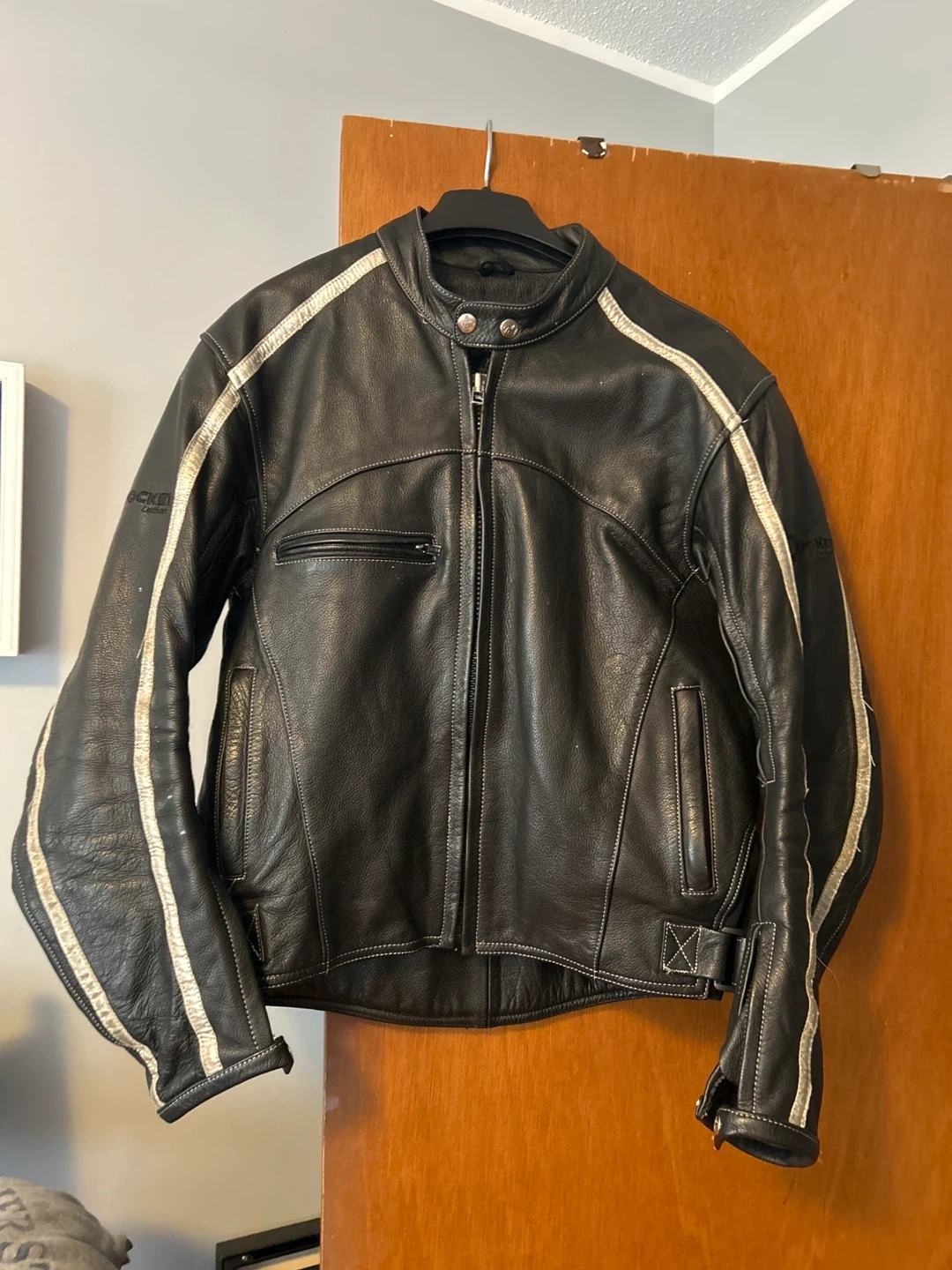This is a black leather motorcycle jacket from Rocket. It features white racing stripes on the sleeves and shoulders. Zipper front closure with multiple pockets.