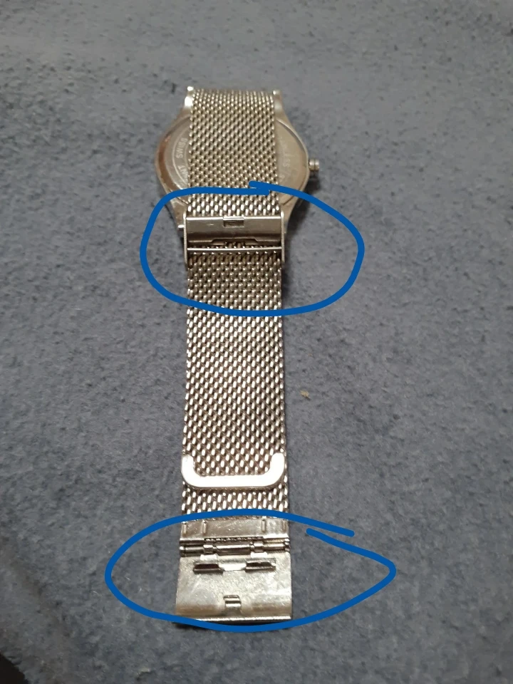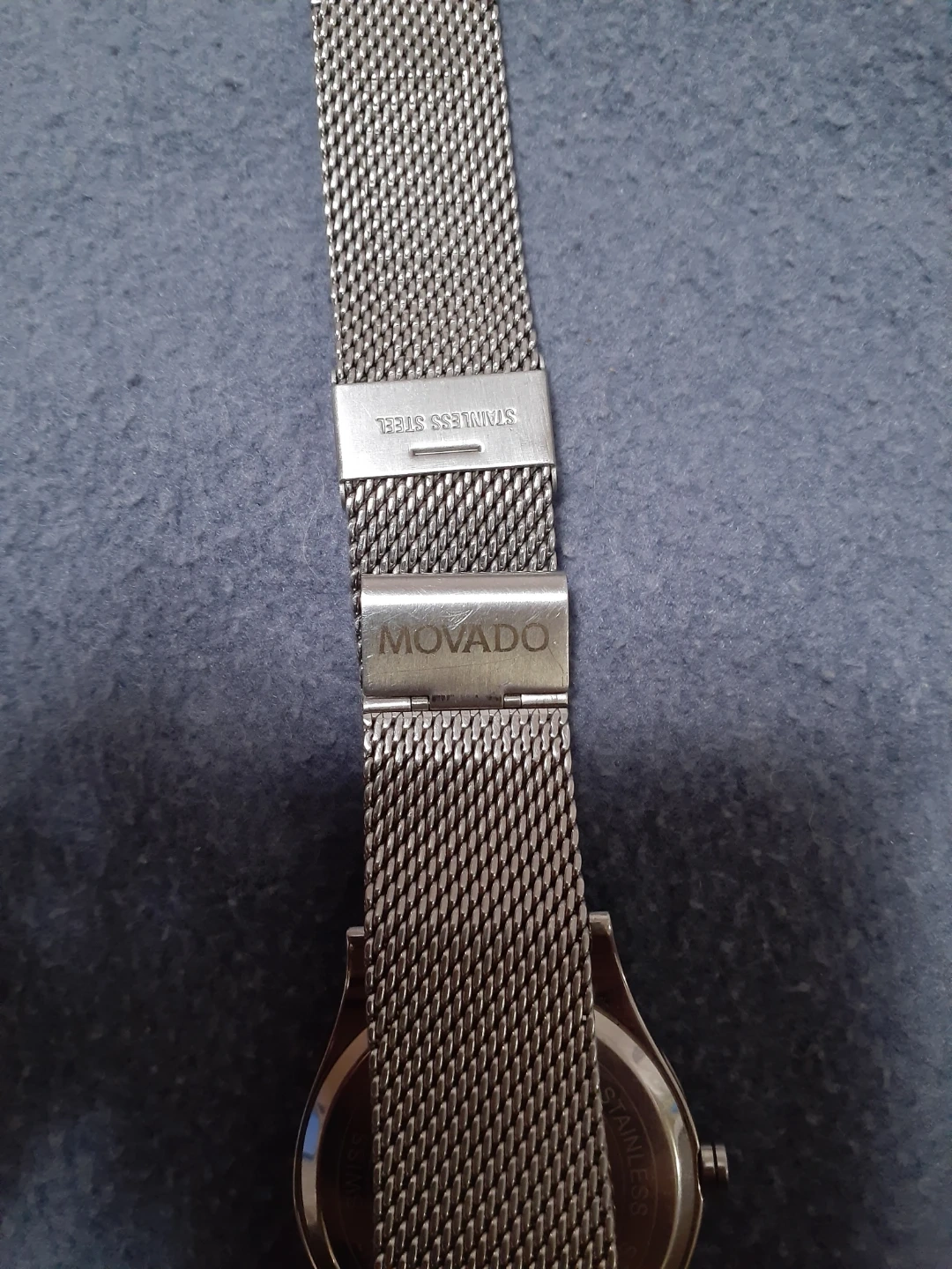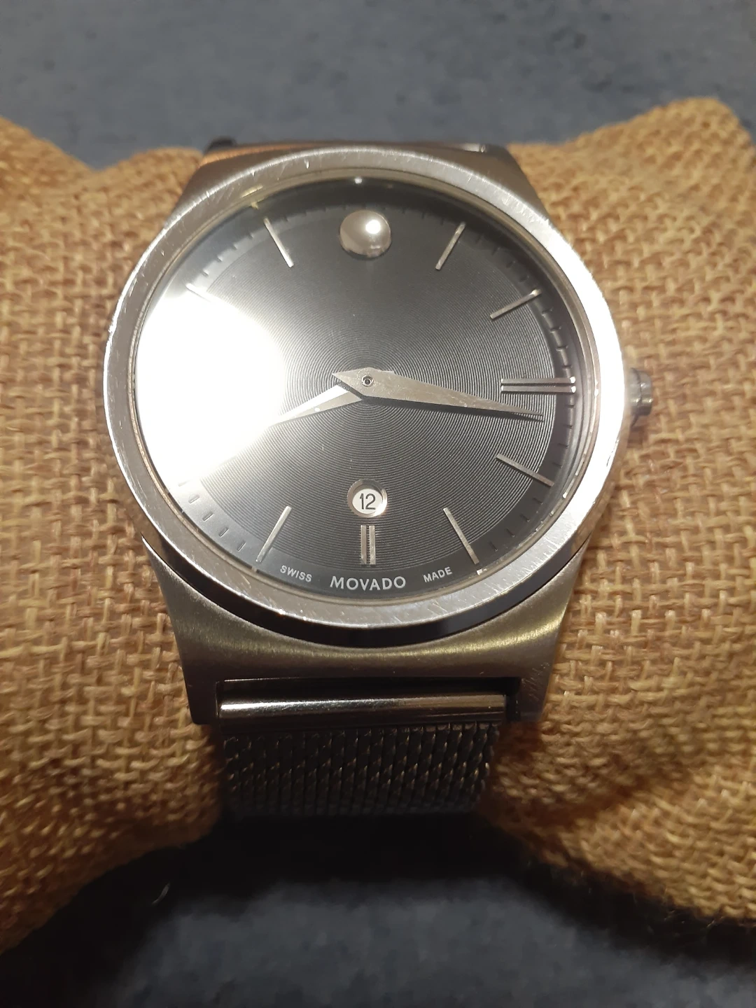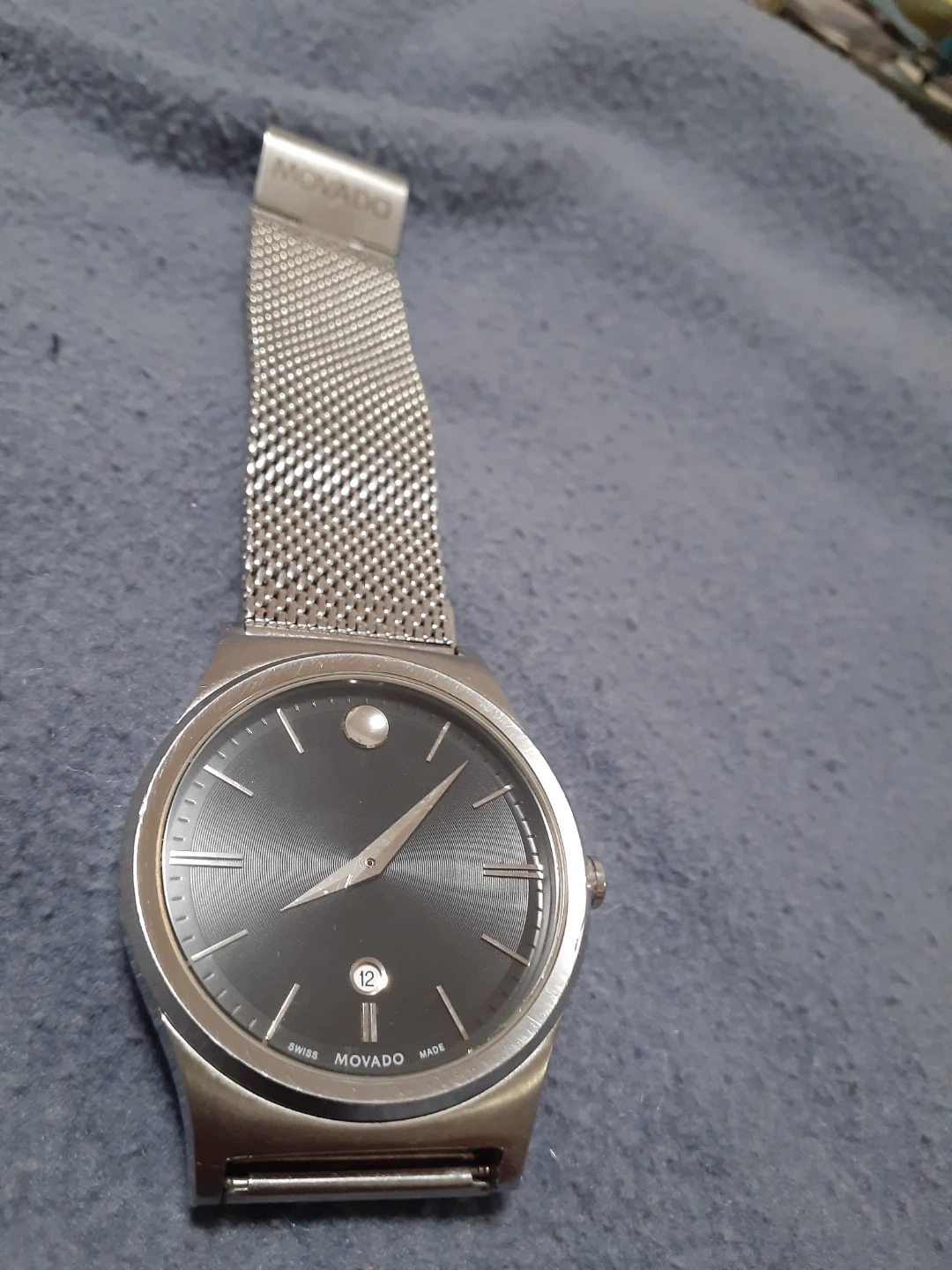 Swiss made Movado watch with a stainless steel mesh band. It features a black dial and a date display...