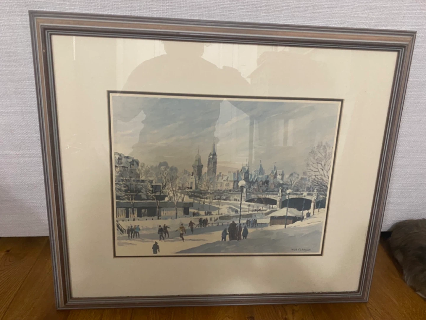 This is a framed watercolour print depicting a winter scene in a city. It shows people walking and buildings with snow. The artwork is matted and framed, ready to hang.