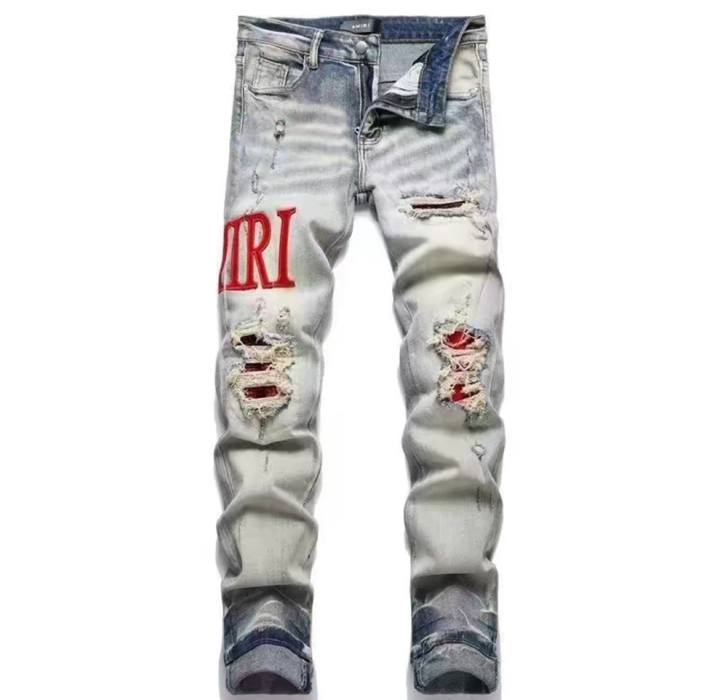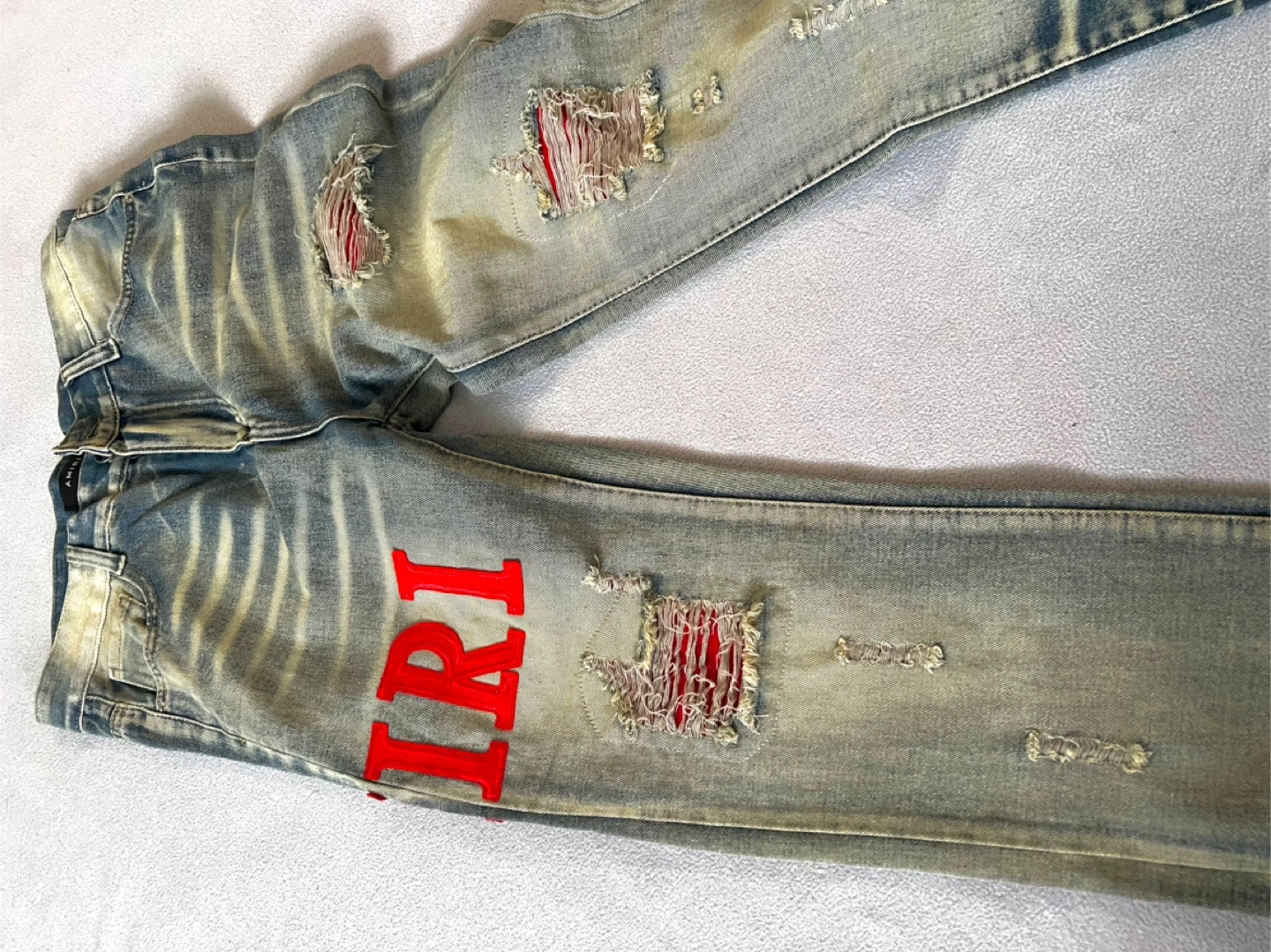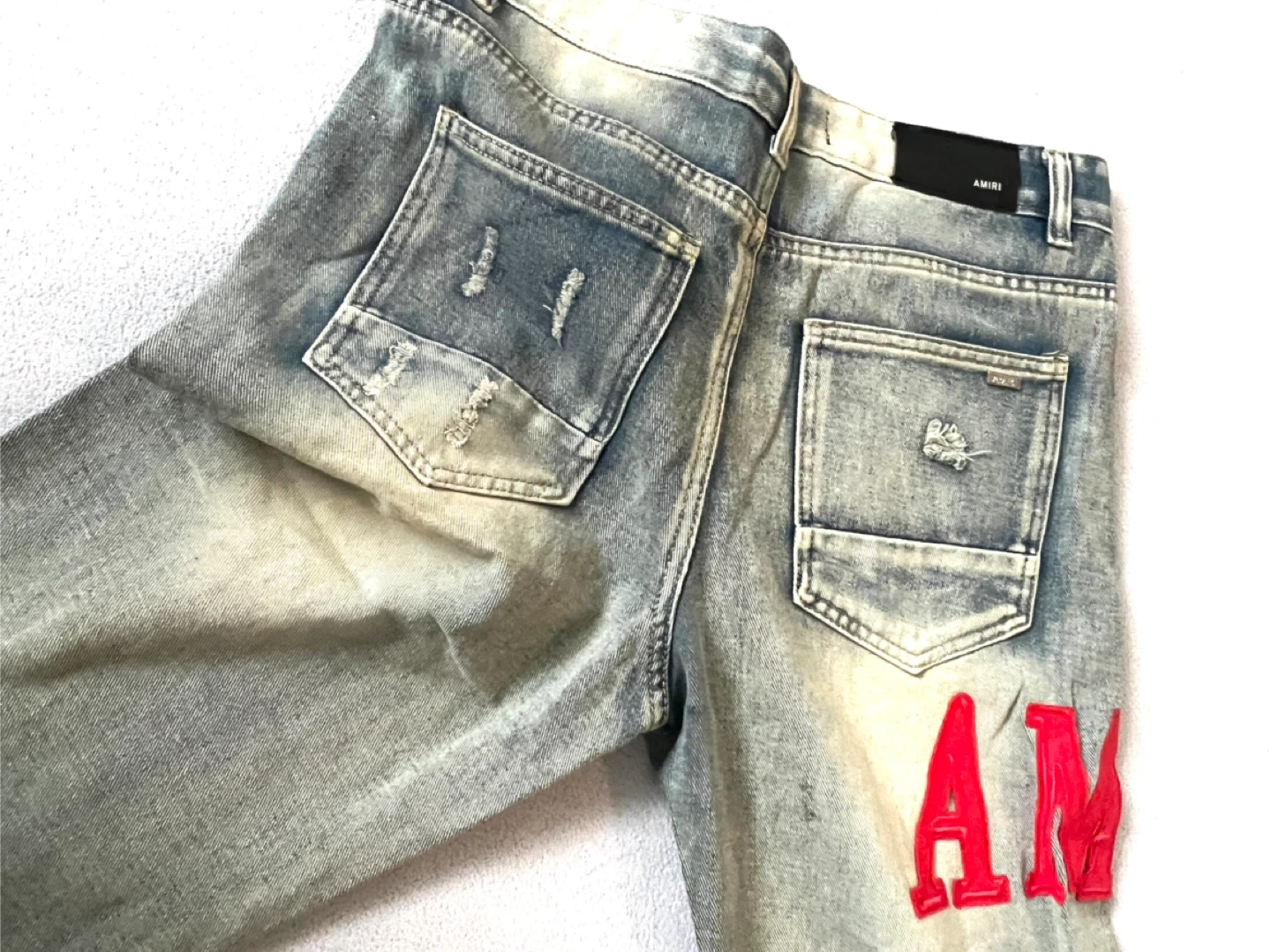 Light wash denim jeans with distressed details and red Amiri logo on the leg. Classic five-pocket styling. Cotton material.