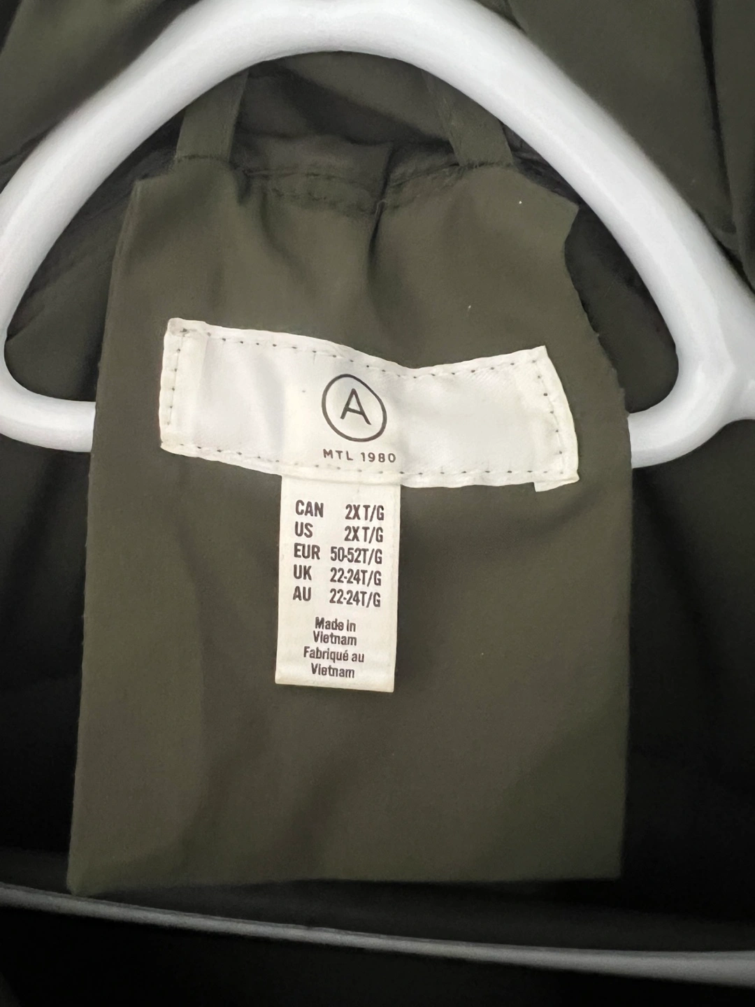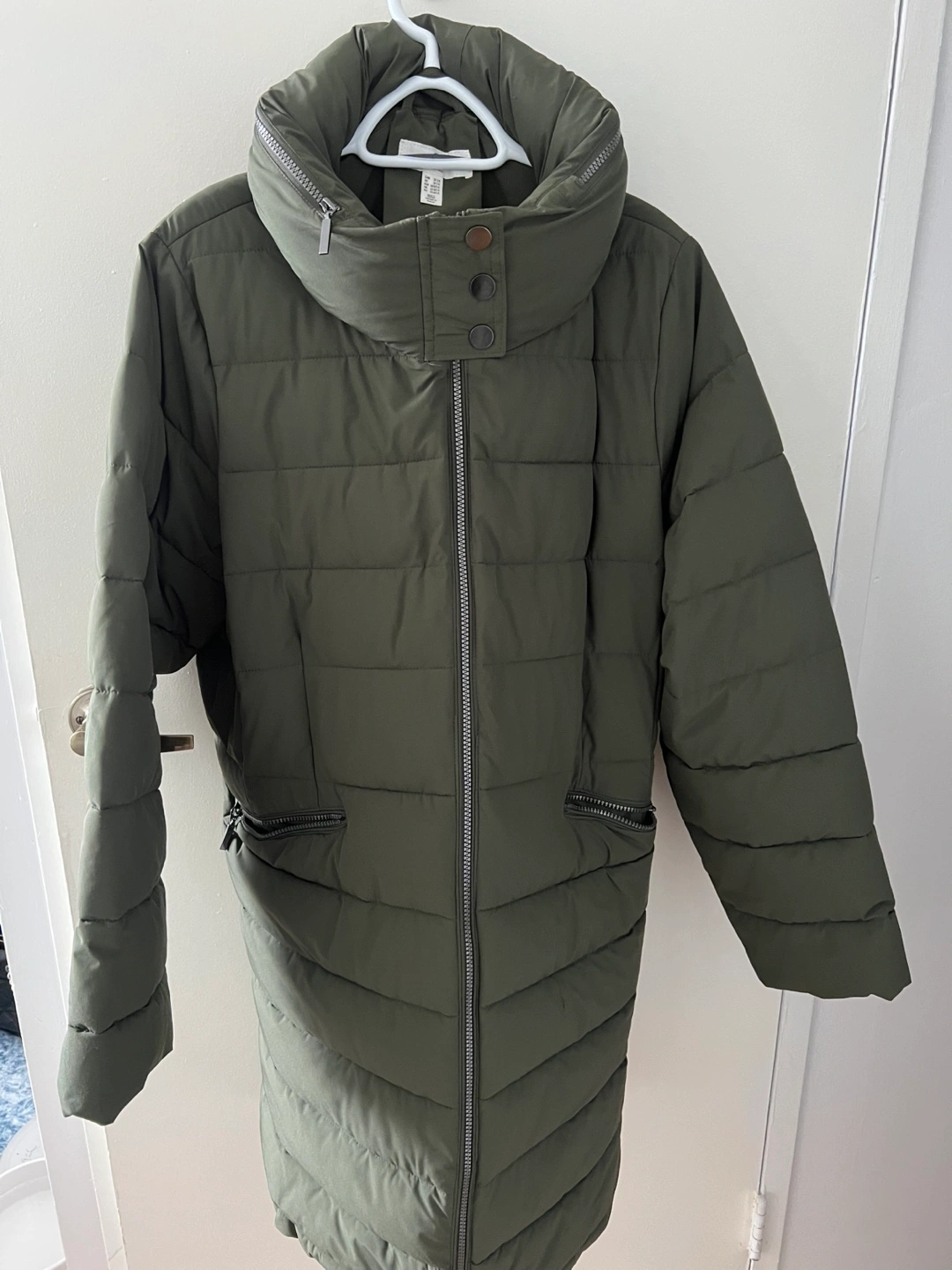 Long olive green puffer jacket. Features a high collar, zipper closure, and side pockets. Drawstring waist. Excellent for colder weather. Pickup and cash only in Scarborough