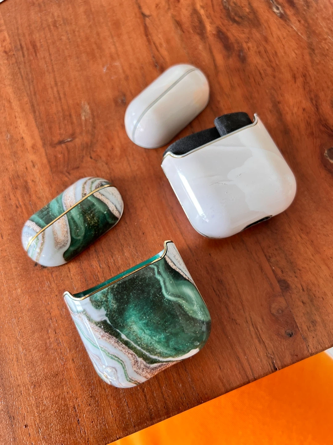 Two IDEAL OF SWEDEN AirPods cases in a marble design. One features a green and white marble pattern with gold trim, and the other is white with a similar marble effect. These cases offer stylish protection for your AirPods.