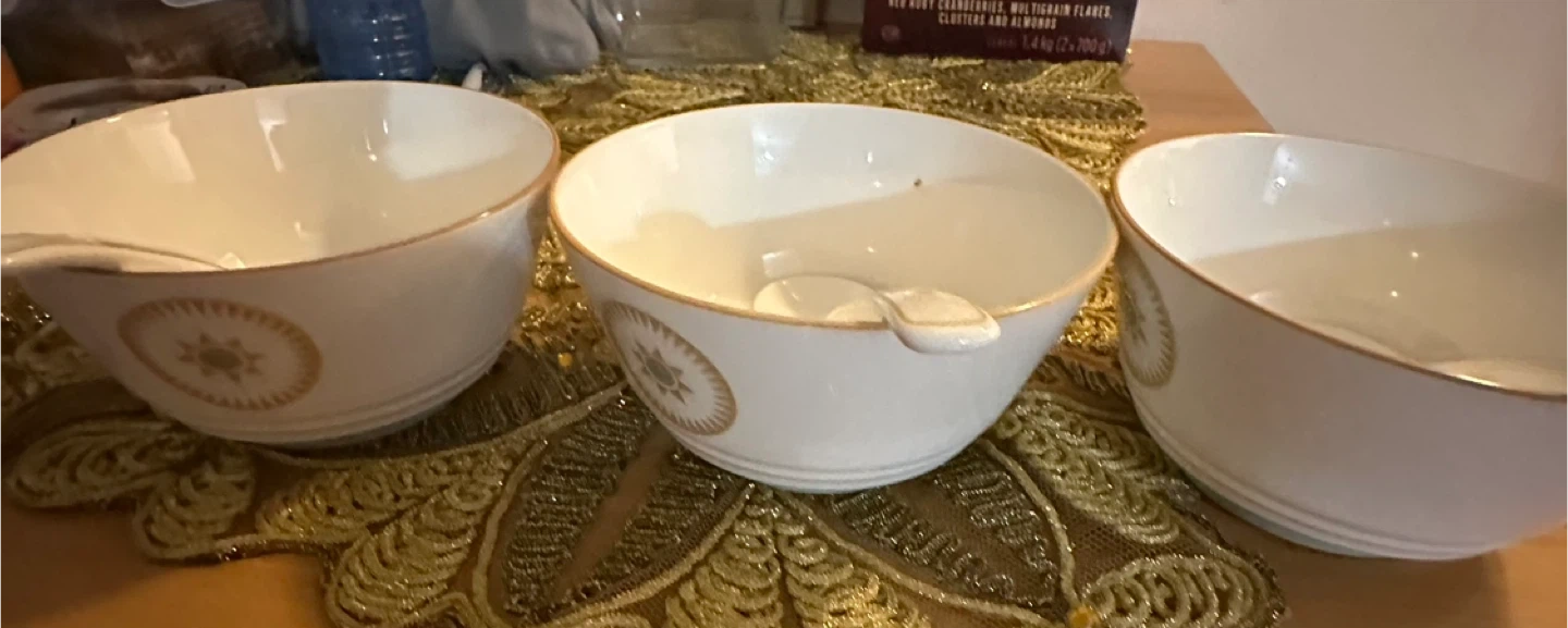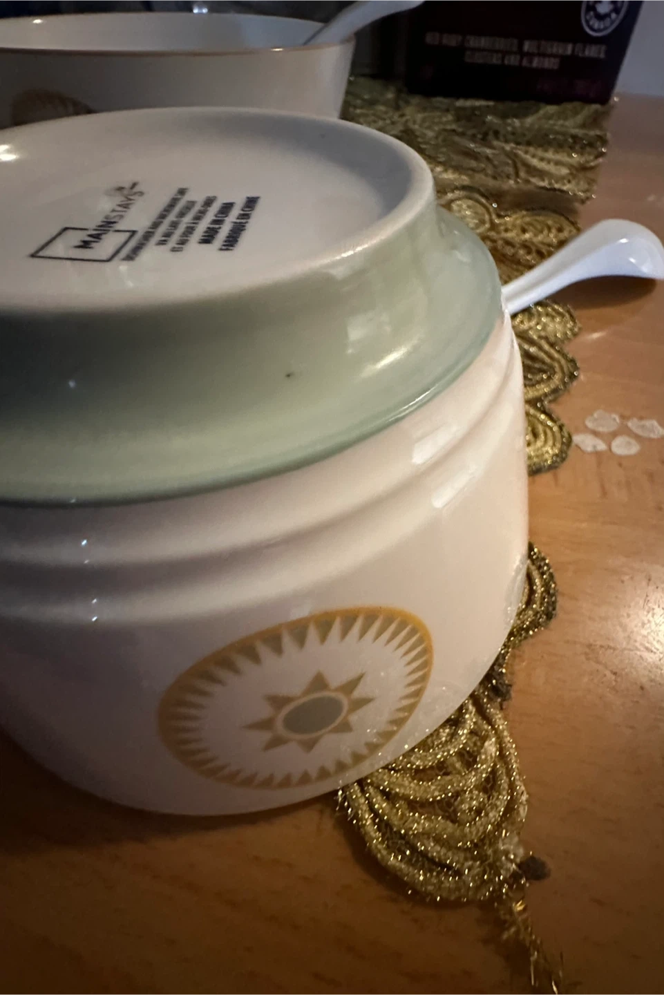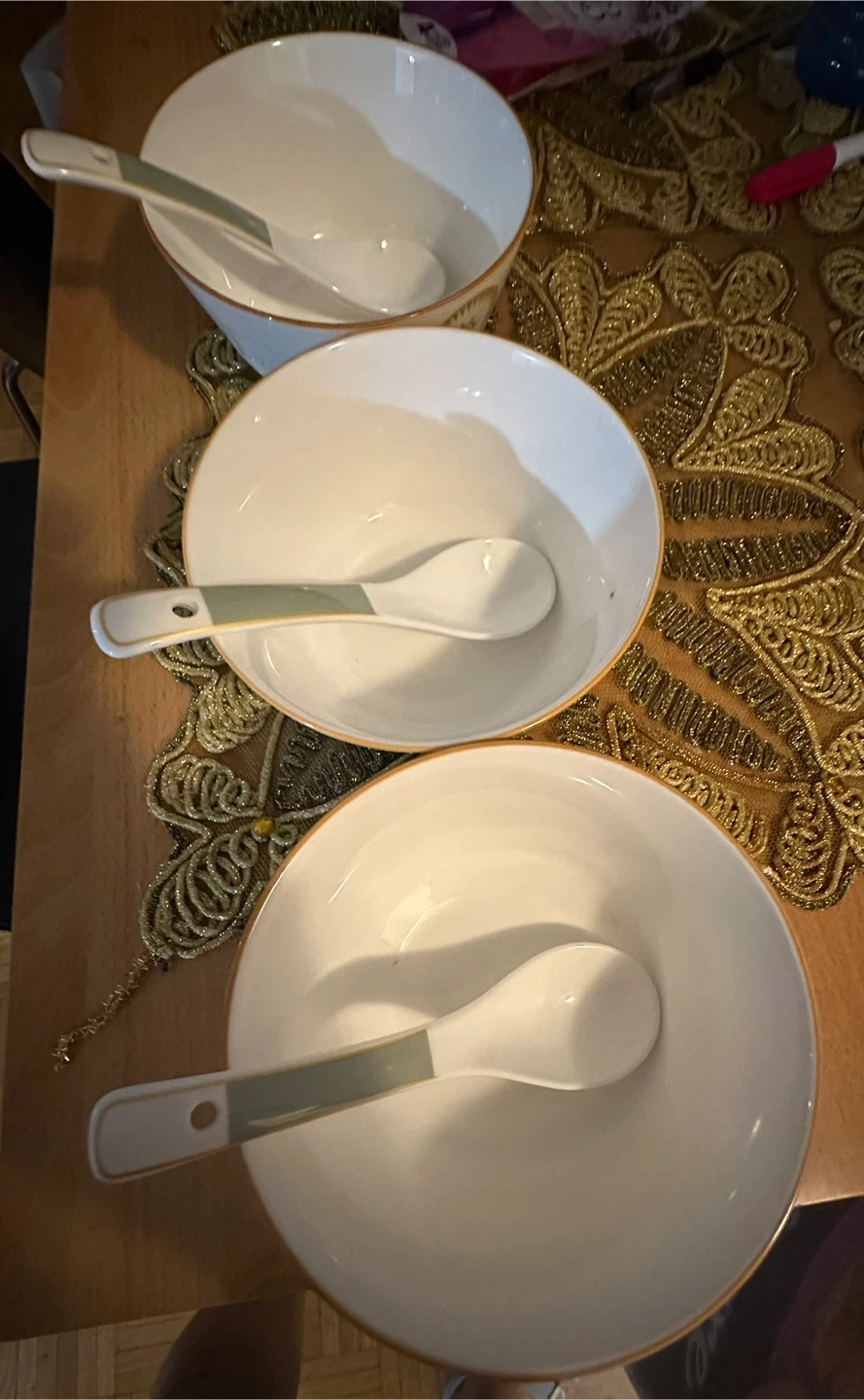 Set of three Mainstays soup bowls, each with a matching spoon. White ceramic with a decorative sunburst pattern and gold trim. Dishwasher and microwave safe.